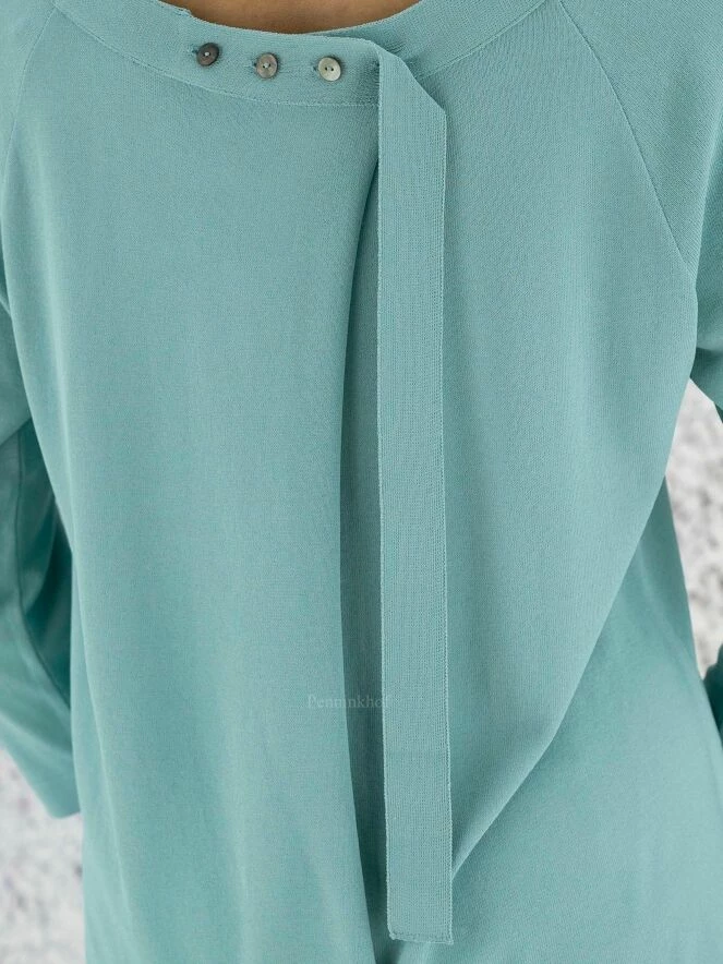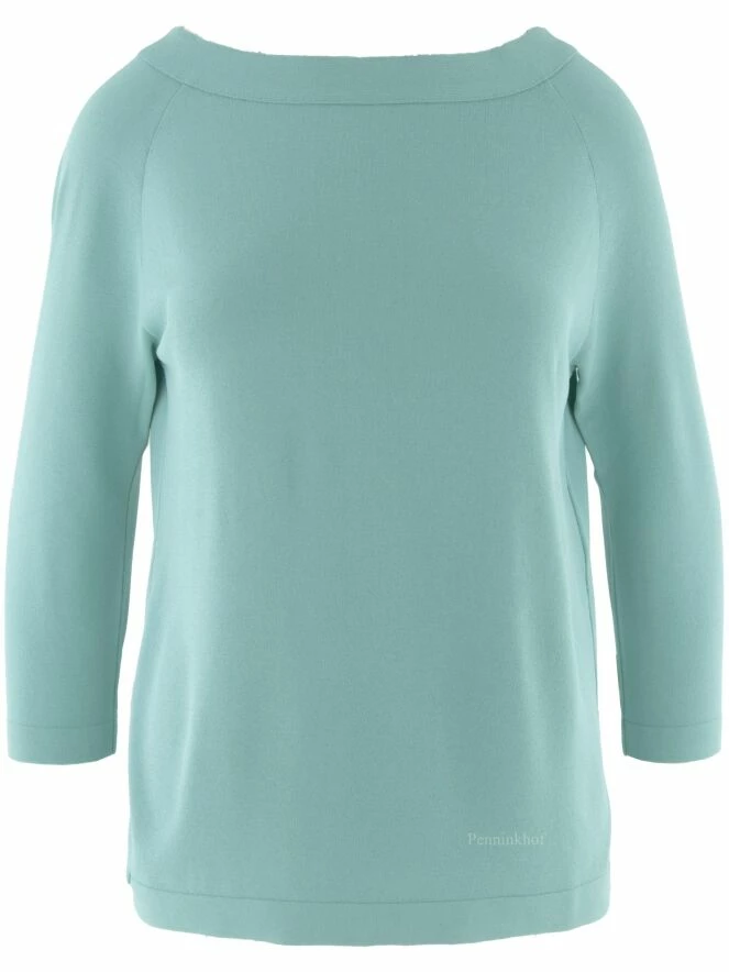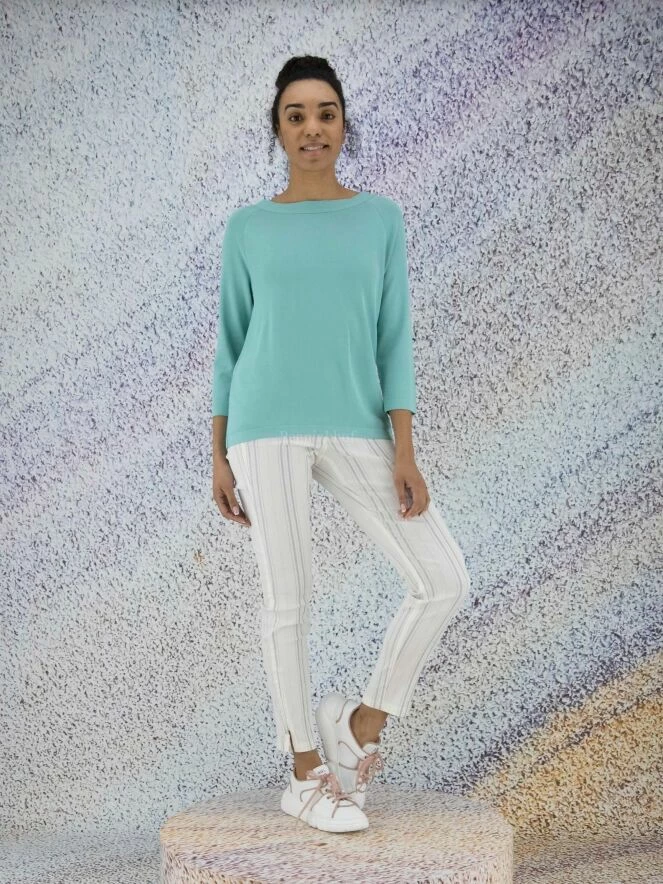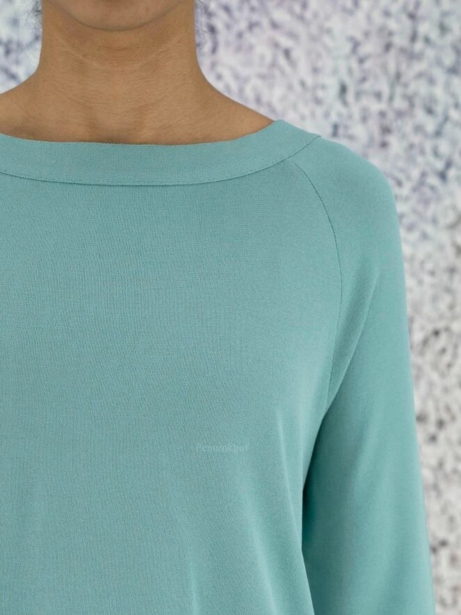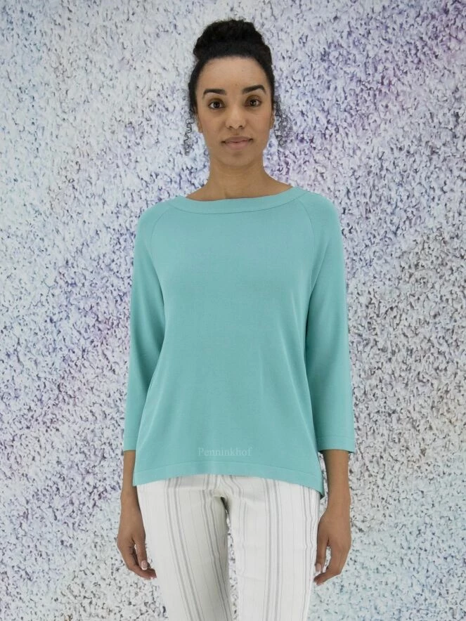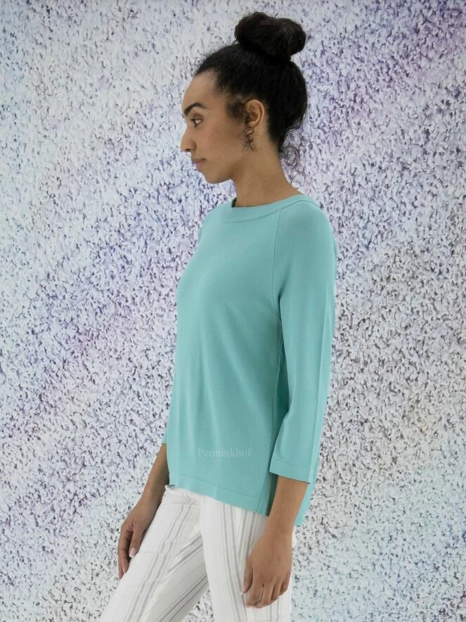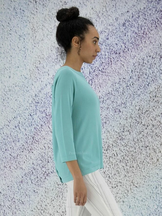 Tee-shirt de la marque Annette Görtz, de couleur turquoise. Il présente une large encolure bateau et des manches mi-longues. Un chevauchement courbe à fermeture à boutons en bas et à l’encolure agrémente le dos. Lavage à la main.
