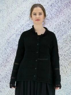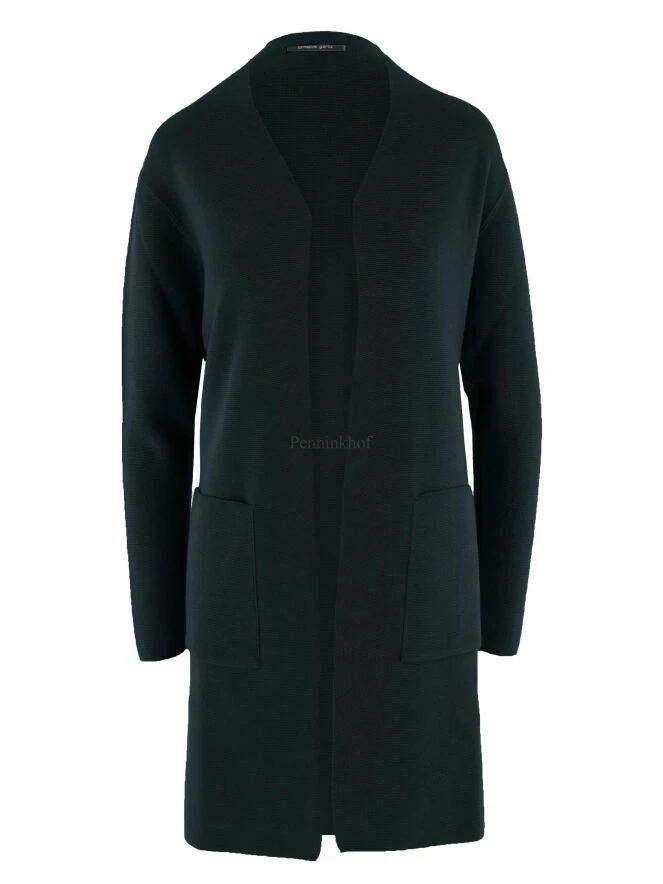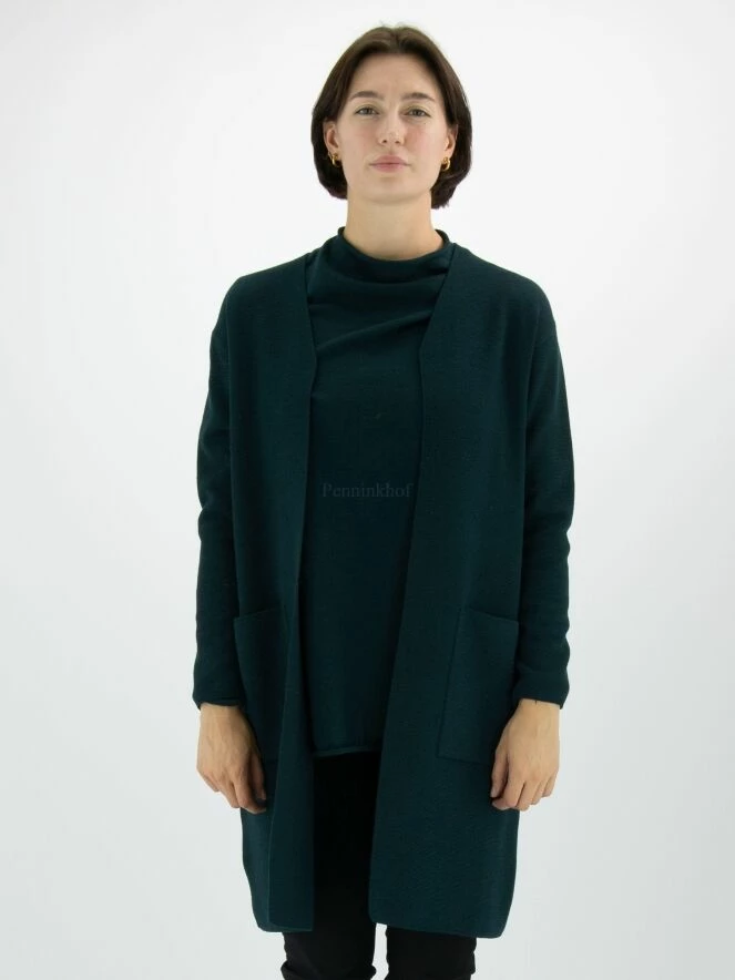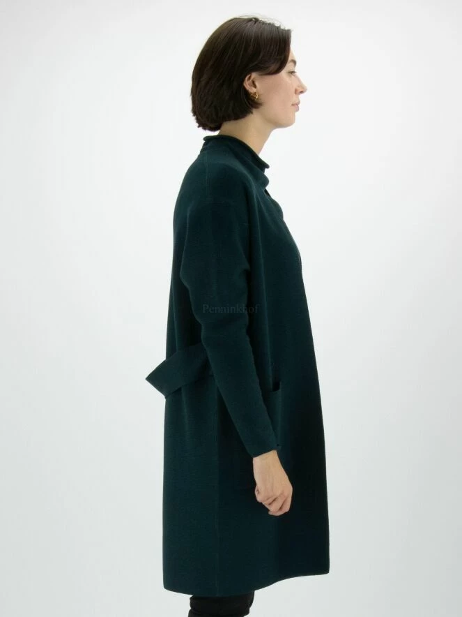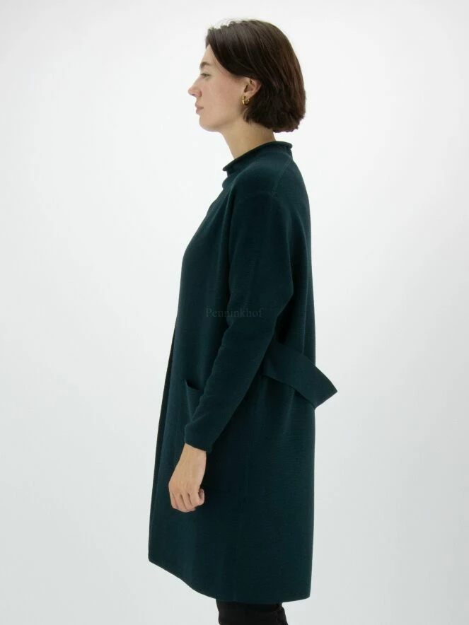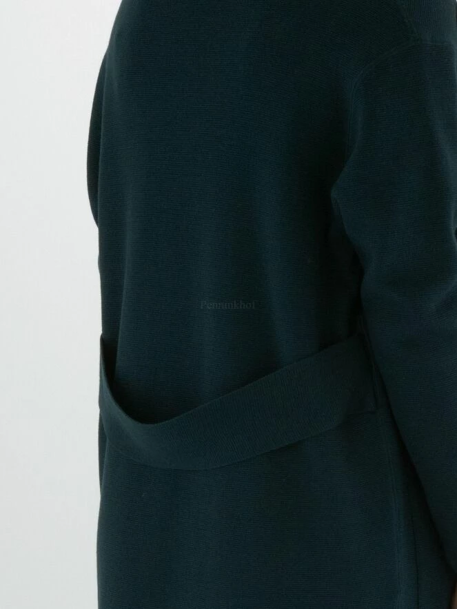 Un luxueux cardigan d’Annette Görtz en vert foncé. Une ceinture dans le même tissu que le cardigan est fixée à la taille. Le cardigan n’a pas de fermeture et peut être lavé à la main.