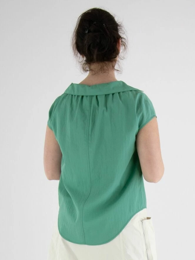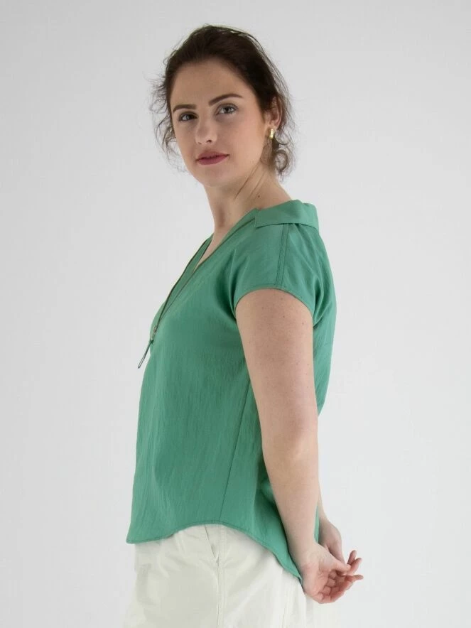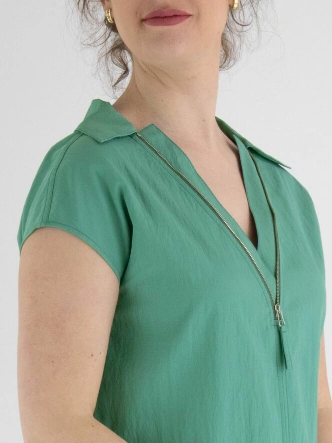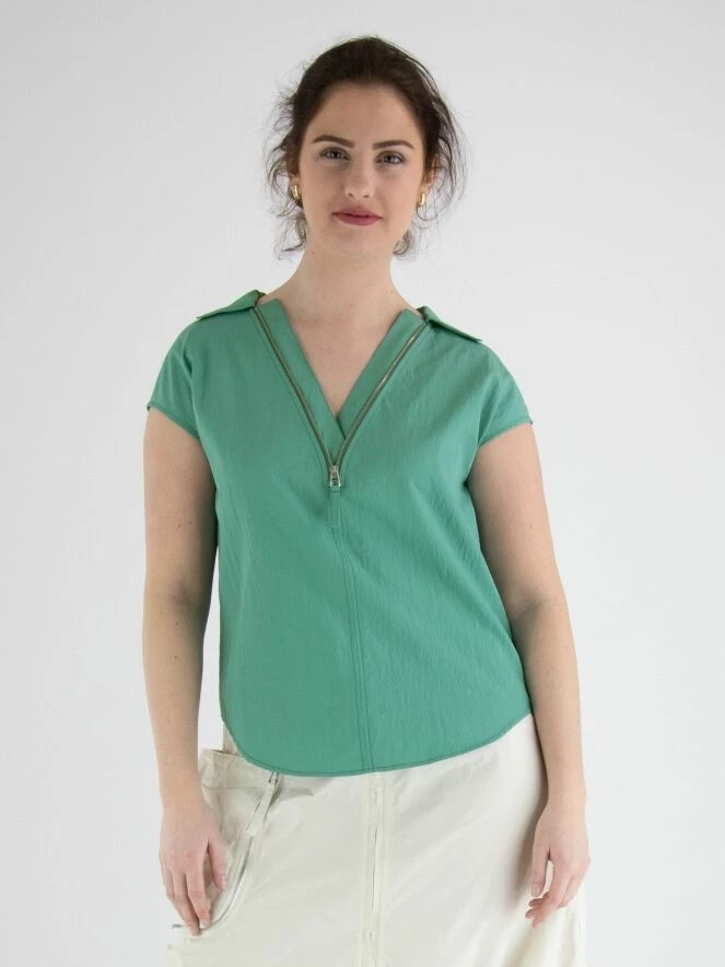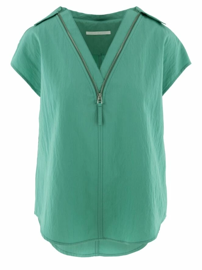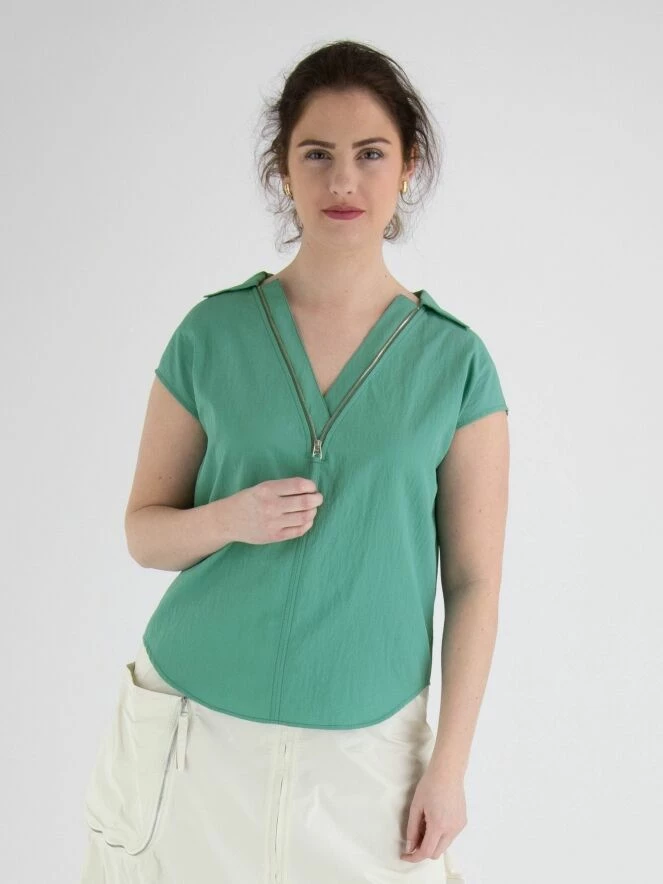 Un haut d’Annette Görtz dans un tissu légèrement froissé de couleur turquoise. Le long du bord de l’encolure en V, il y a une fermeture éclair décorative avec un petit col au cou. Ce haut peut être lavé à 30 degrés.
