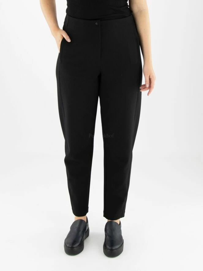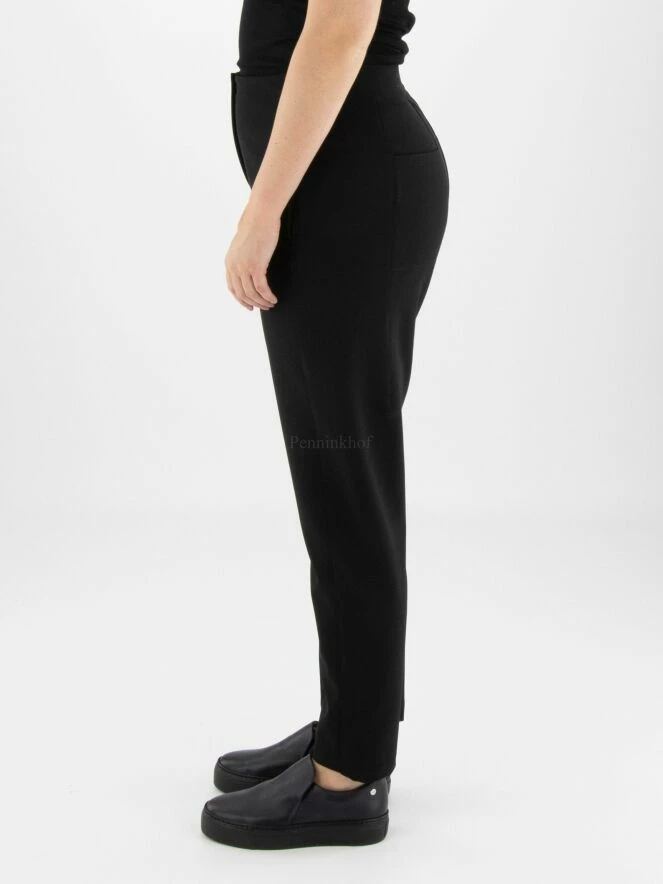 Pantalon slim d’Annette Görtz en vert foncé. La taille est élastiquée sur les côtés à l’arrière. Les poches latérales sont fermées par une fermeture éclair. Ce pantalon peut être lavé à 30 degrés.