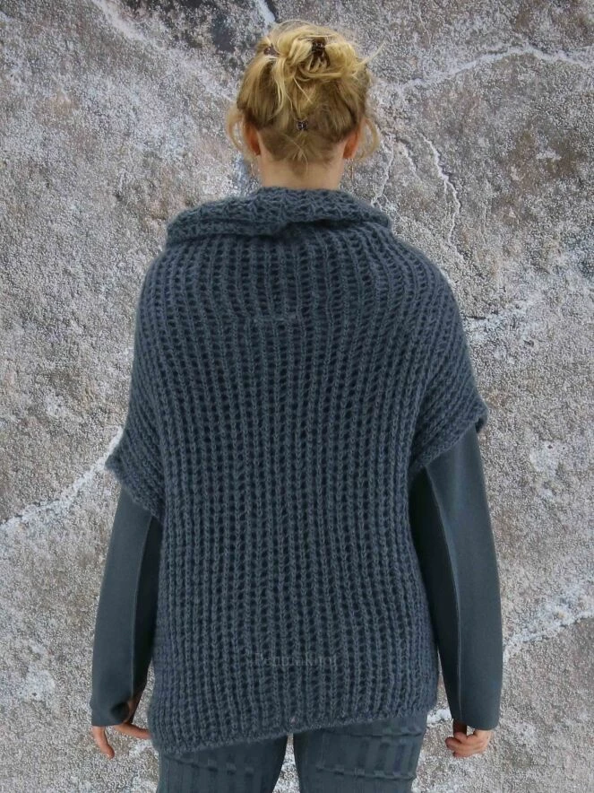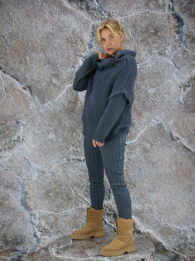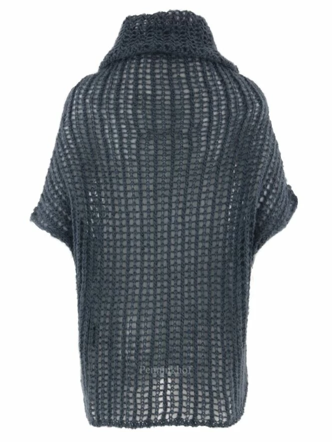 Pull en tricot à maille ouverte de la marque Annette Görtz, de couleur gris bleu. Le pull présente un large col roulé suspend et de manches courtes chauve-souris. Lavage à la main.