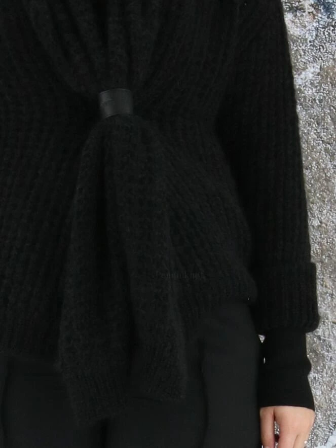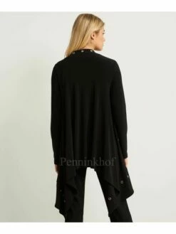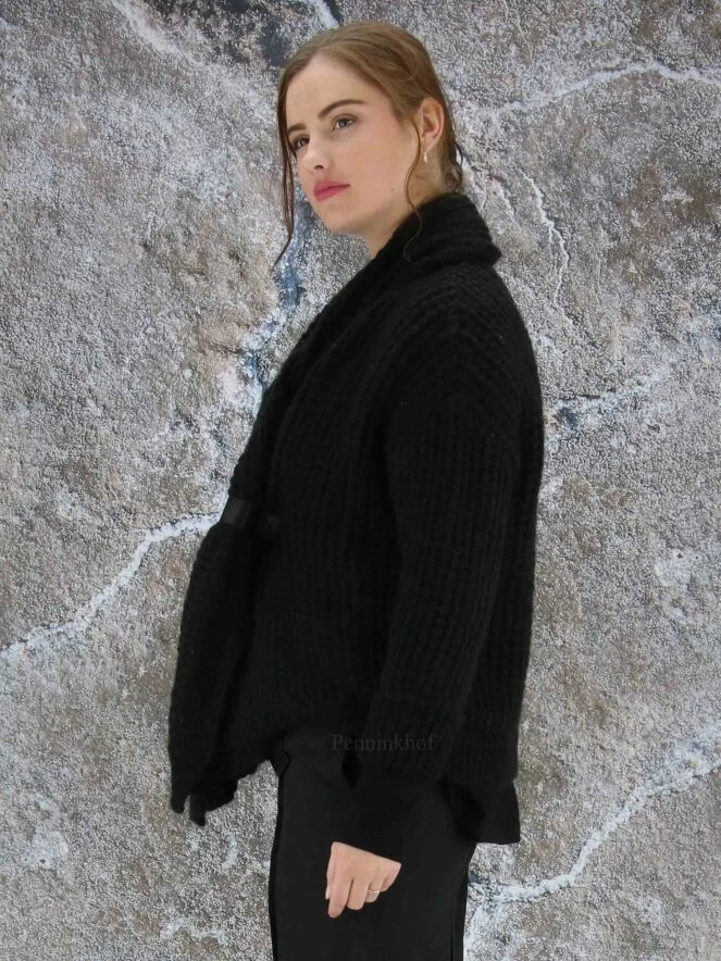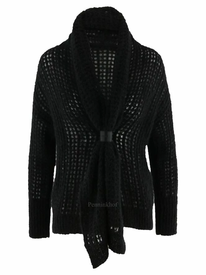 Luxueux cardigan à maille ouverte de la marque Annette Görtz, de couleur noire. La fermeture se fait par un bouton pression à garniture en cuir qui resserre le col châle au niveau de la taille. Lavage à la main.