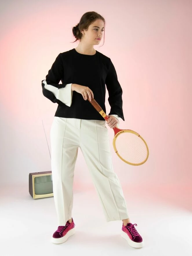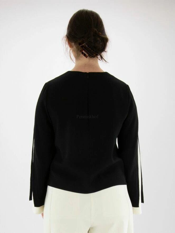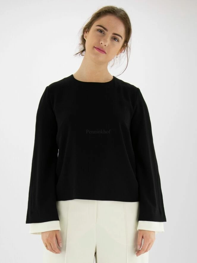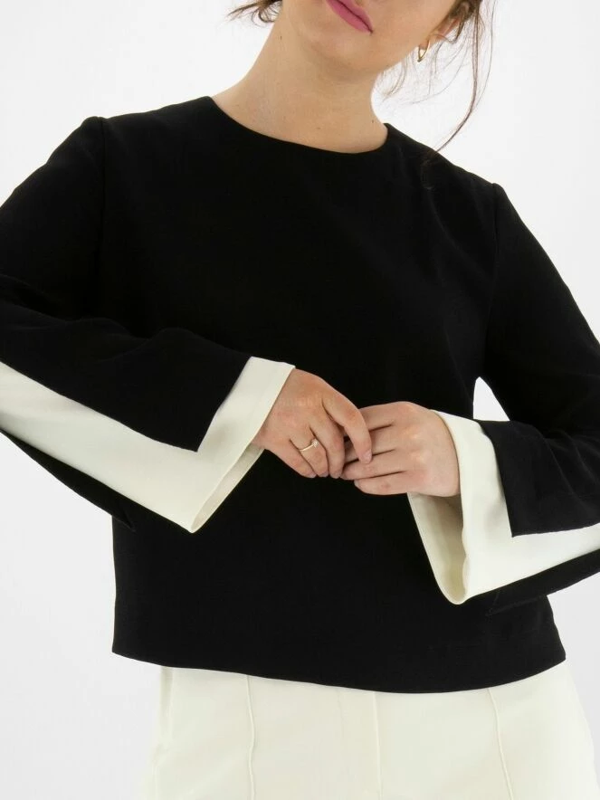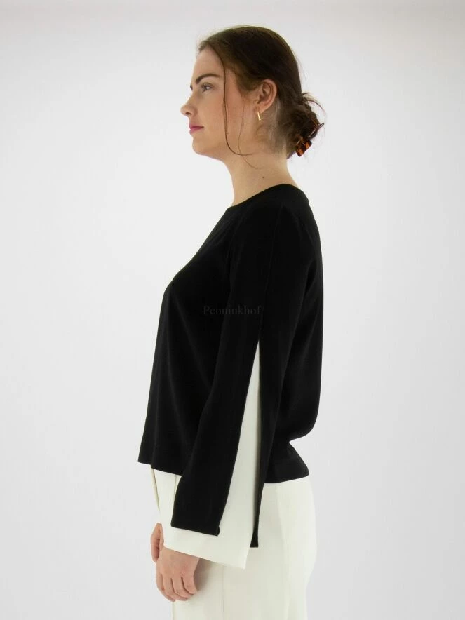 Une chemise d’Annette Görtz en noir. À partir de la partie supérieure du bras, les côtés sont ouverts sur l’extérieur, sous lesquels se trouve un tissu blanc crème qui fait également office de manchette courte à l’extrémité des manches longues. Une courte fermeture éclair est insérée dans l’encolure ronde au milieu du dos. Cette T – shirt peut être lavée à la main et va avec le pantalon d’Annette Görtz dont la référence est : 100002369.
