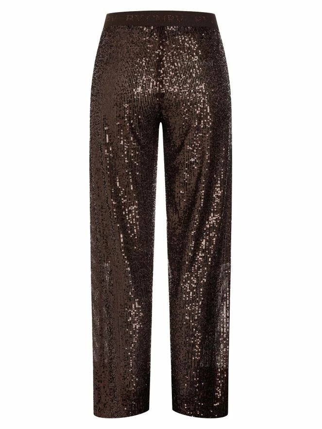 Pantalon droit de la marque Cambio, de couleur bronze. Le pantalon est recouvert de paillettes de la même couleur que le tissu. La taille est équipée d’un élastique marron à lettrage brillant. Lavage à la main.
