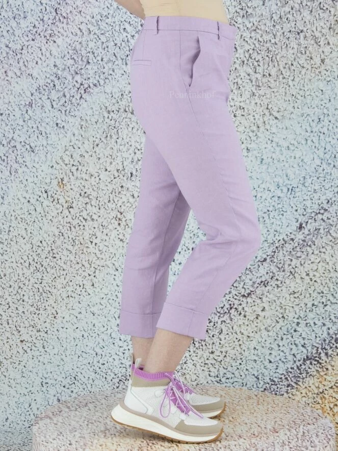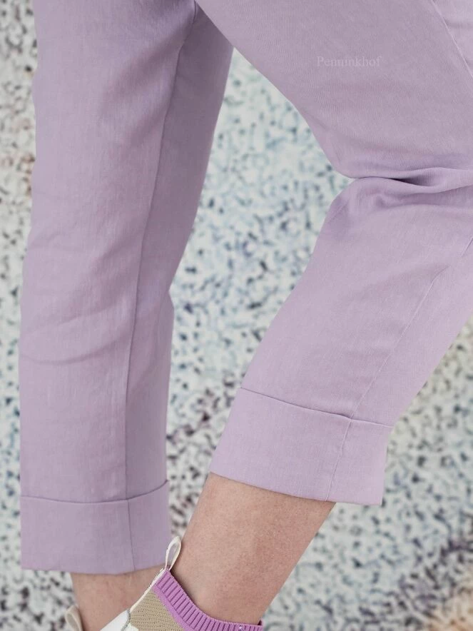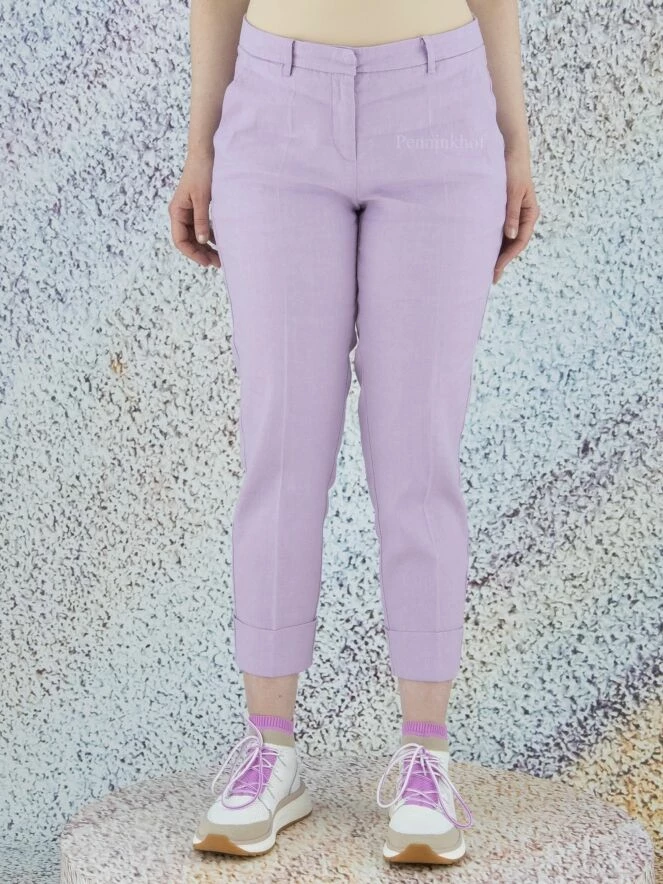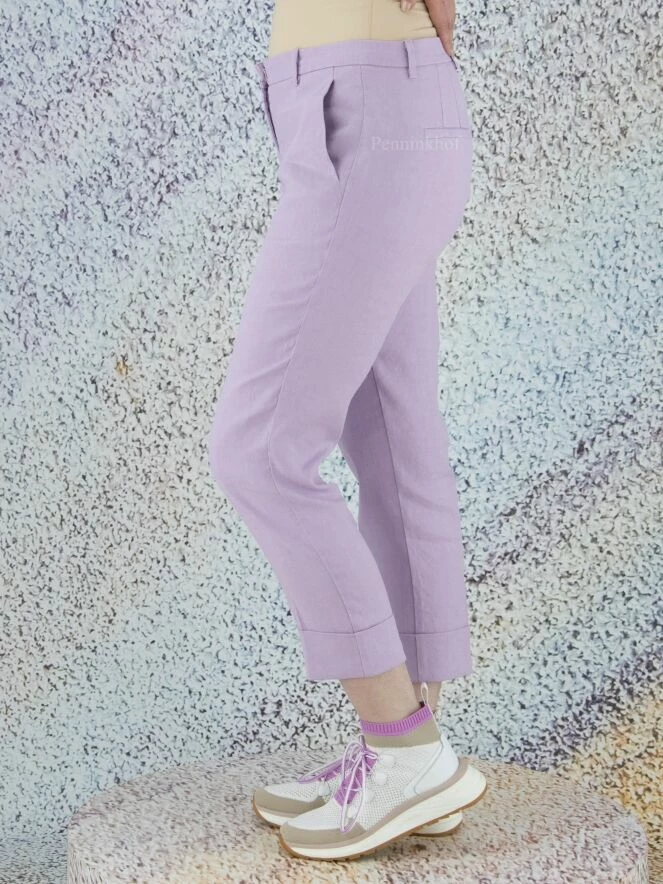 Pantalon de la marque Cambio, de couleur lilas. Le pantalon est doté de poches latérales et d’un large revers au bas des jambes. Lavage à la main.