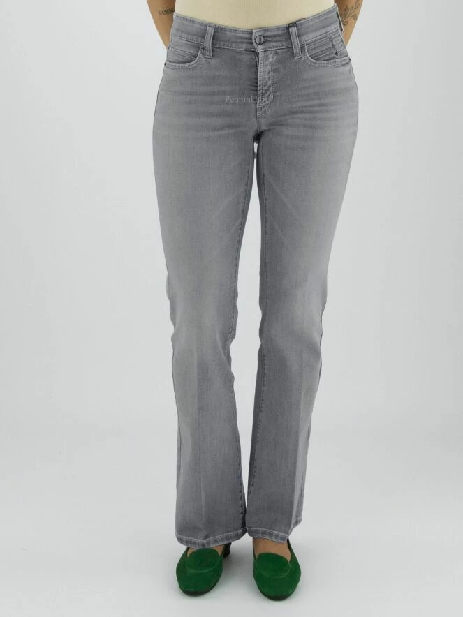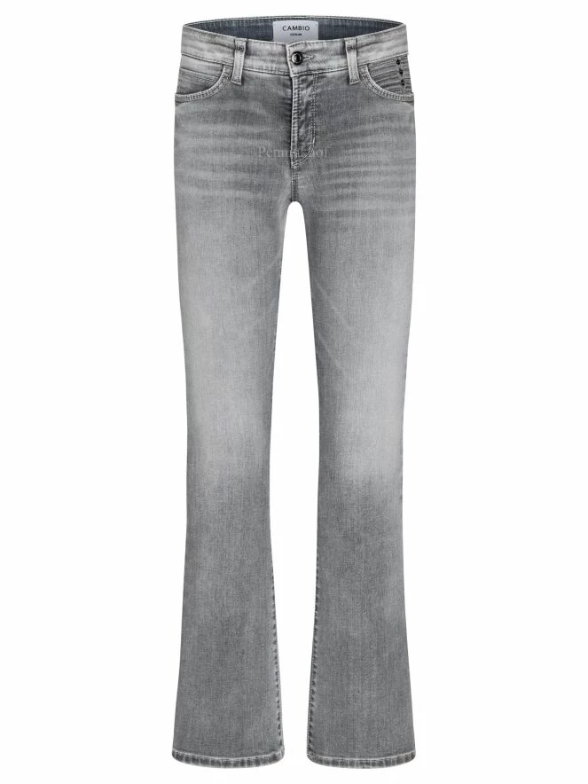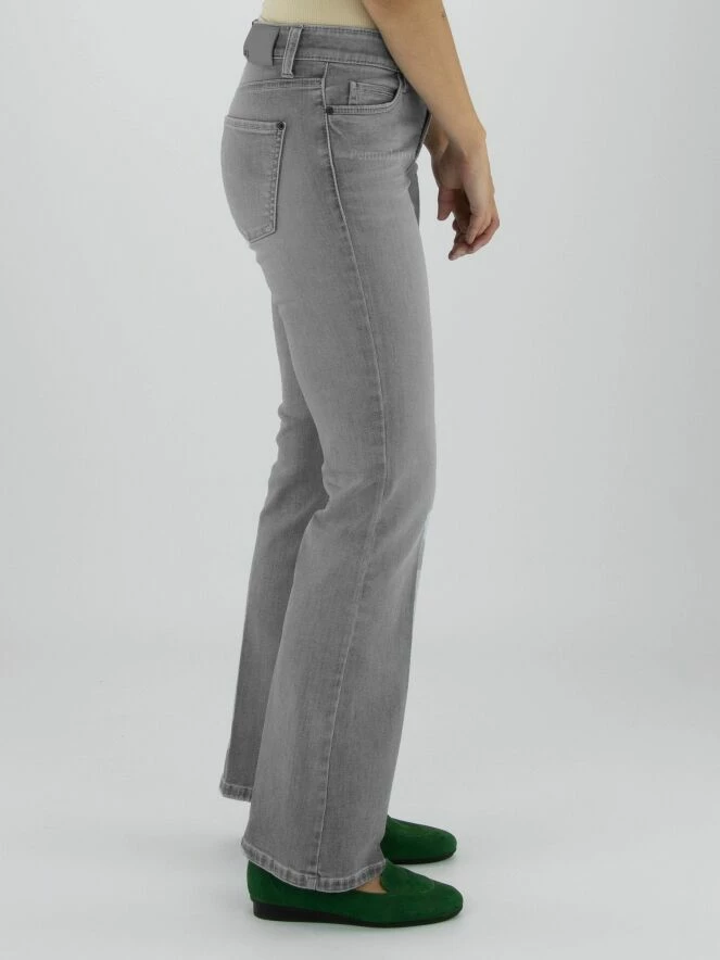 Jean évasé de Cambio en gris clair. Le jean a 5 poches et peut être lavé à 30 degrés.