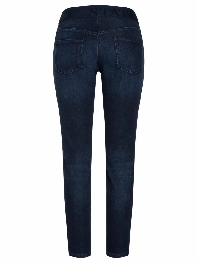 Jeans Ă la coupe ajustĂ©e, de la marque Cambio, en denim de couleur bleu jeans. Il est Ă©quipĂ© d’un large Ă©lastique Ă la taille avec marquage en lettres noires. Modèle Ă 5 poches. Lavage Ă 30 degrĂ©s.