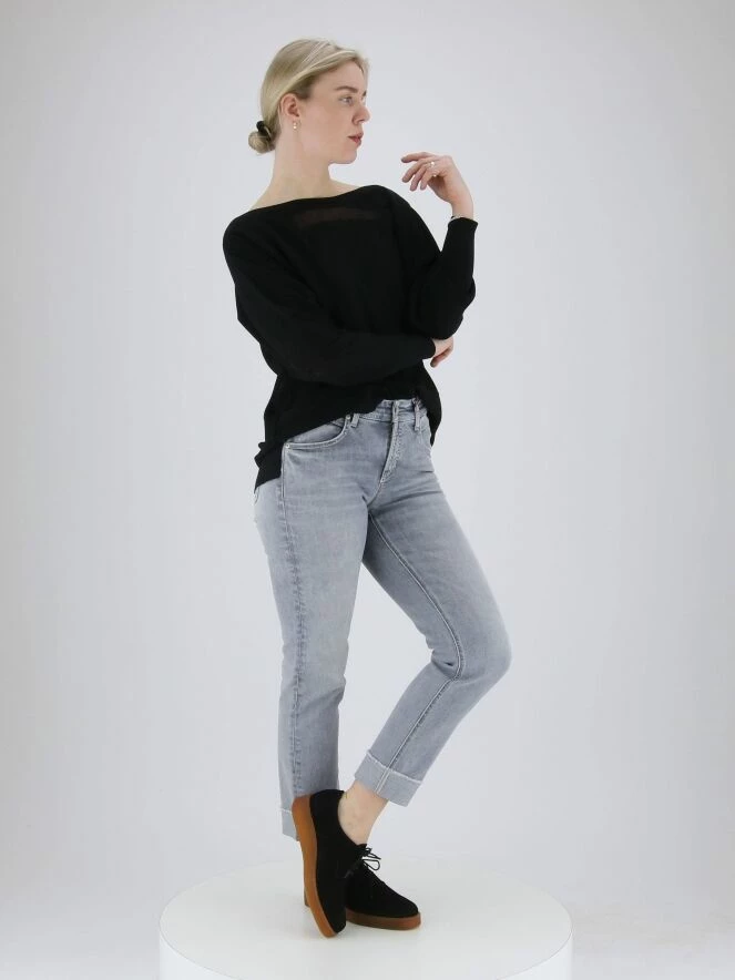 Jeans délavé de la marque Cambio, de couleur grise. Modèle à 5 poches. Un revers habille le bas des jambes orné d’une courte bande de strass. Lavage à 30 degrés.