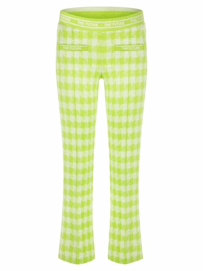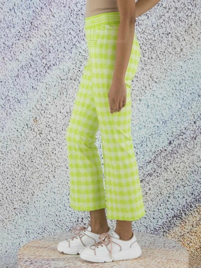 Pantalon de la marque Cambio, à carreaux vichy aux couleurs vert lime et blanc. Une bande élastique équipe la taille. Une couture centrale habille la jambe des poches à l’ourlet. Le bas des jambes est évasé. Lavage à 30 degrés.