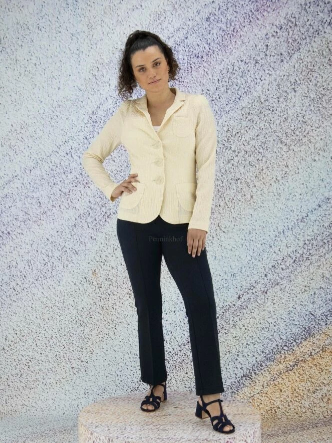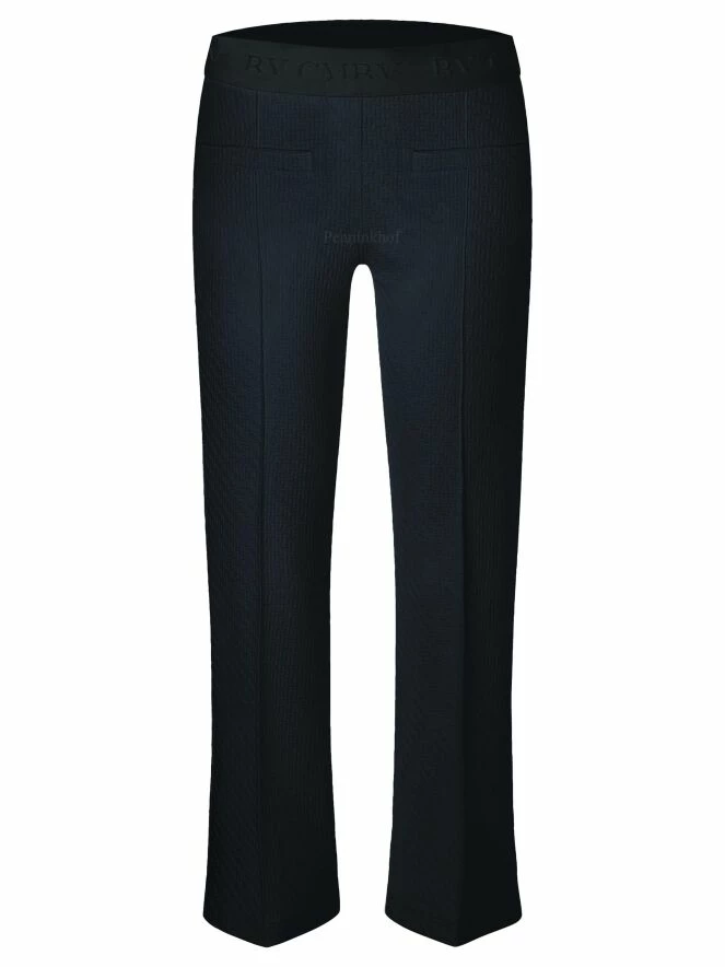 Pantalon Ă©vasĂ© de la marque Cambio, dans une structure en relief de couleur bleu marine. La taille est Ă©quipĂ©e d’une bande Ă©lastique blanche. Lavage Ă la main.