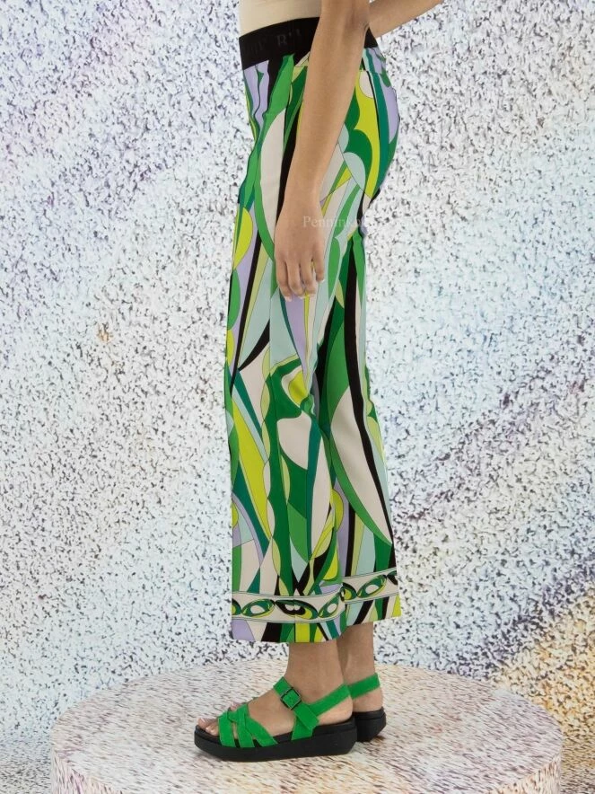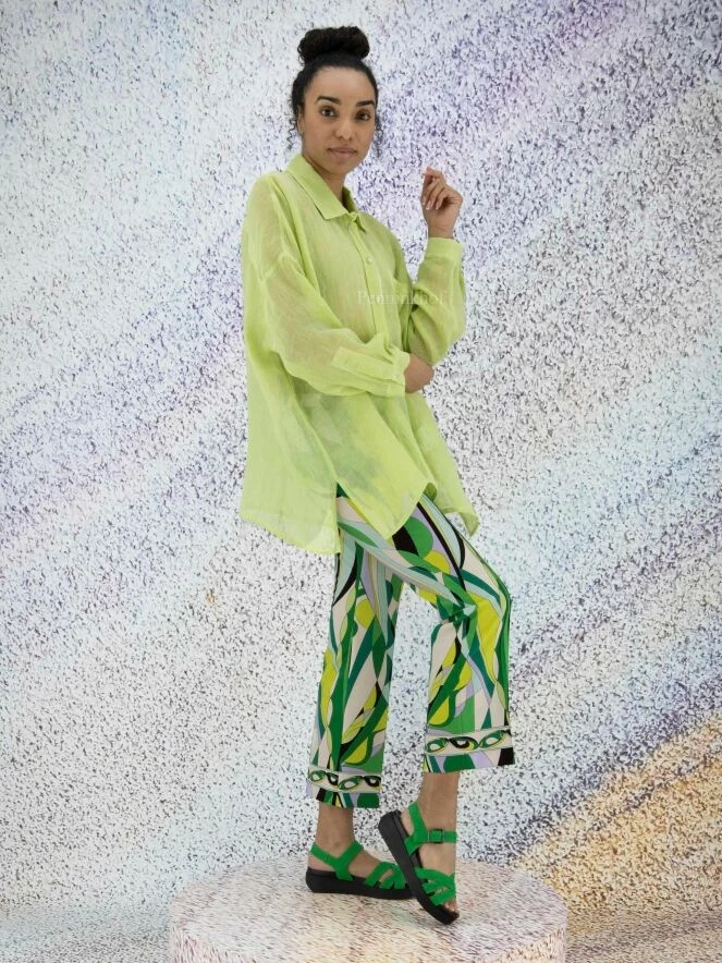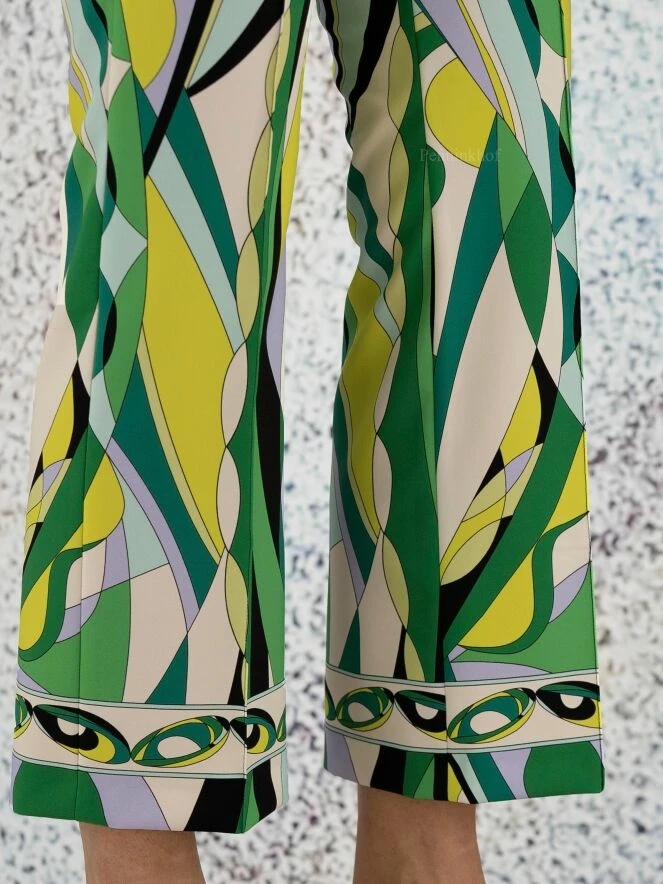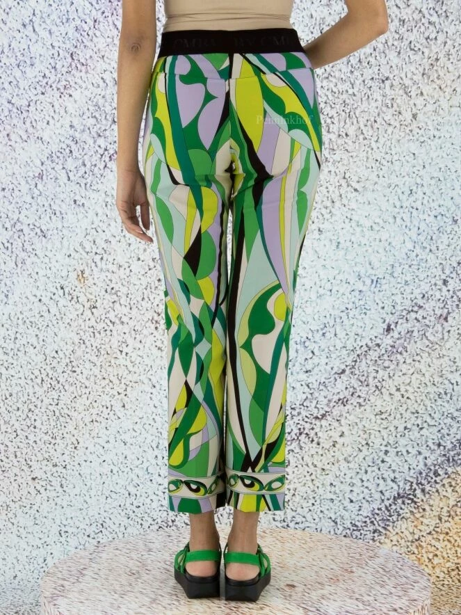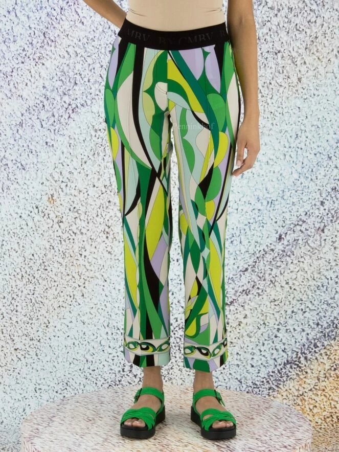 Pantalon de la marque Cambio, à imprimé pop art aux multiples nuances de vert avec du blanc crème, rose et noir. Une bande élastique noire équipe la taille. Un plis de rassage habille le milieu de la jambe. Lavage à 30 degrés.