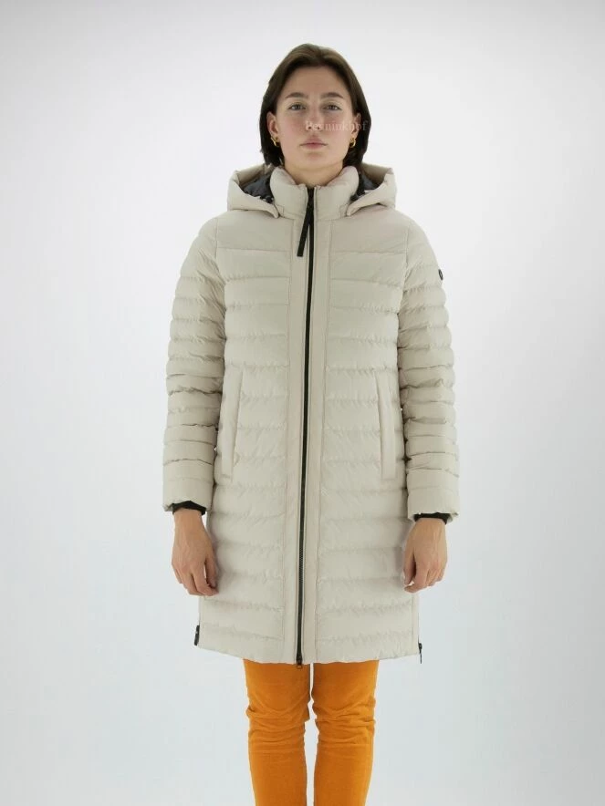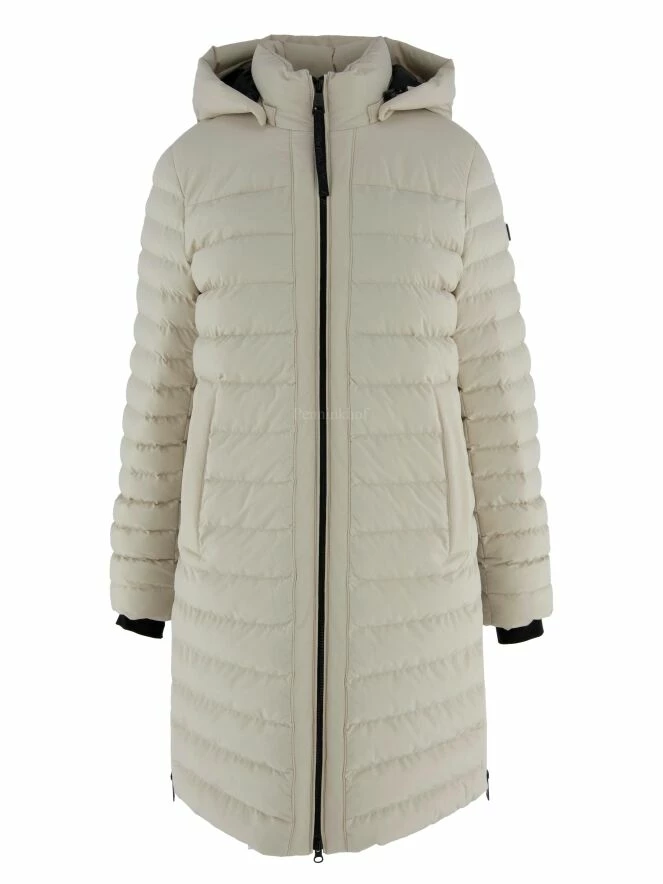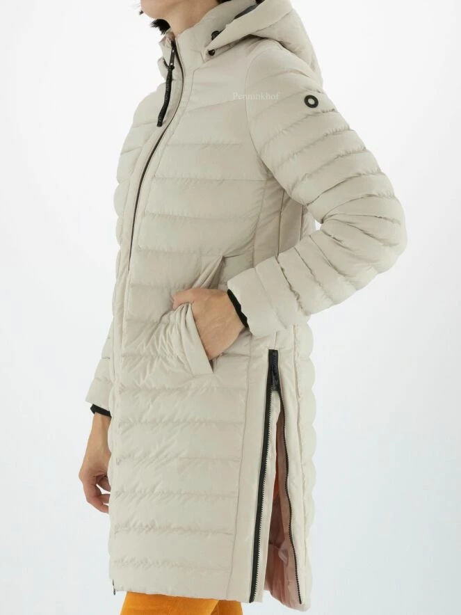 Un manteau amidonné de Fuchs Schmitt dans une couleur kit. La doudoune est munie d’une capuche amovible et d’une fermeture éclair. Les manches longues sont terminées par des poignets noirs. Des fermetures éclair sur les côtés permettent de créer des fentes. Le manteau a des poches latérales et peut être lavé à 30 degrés.