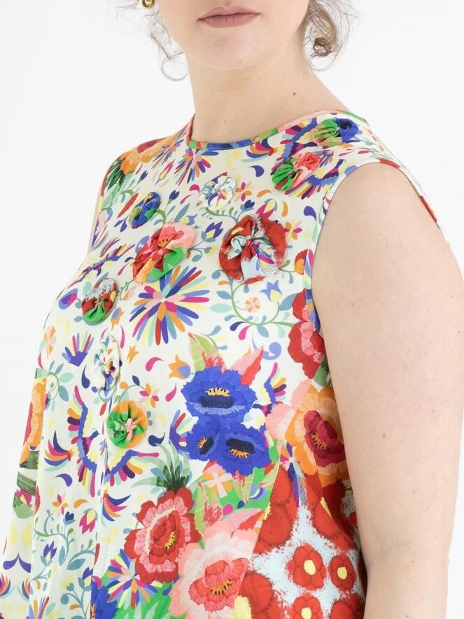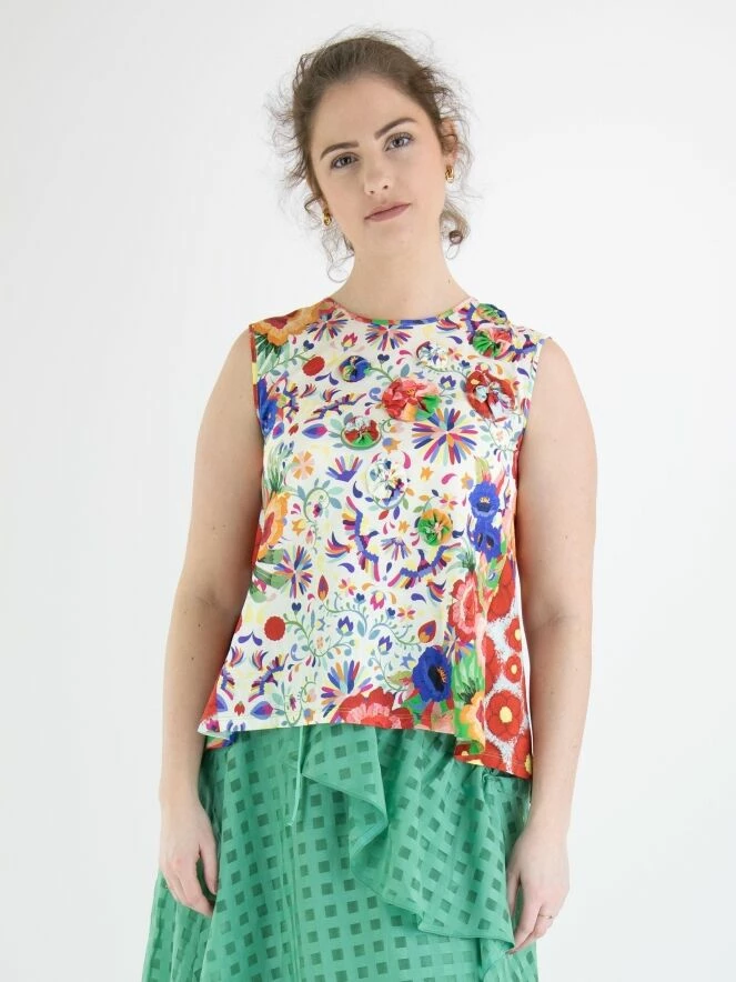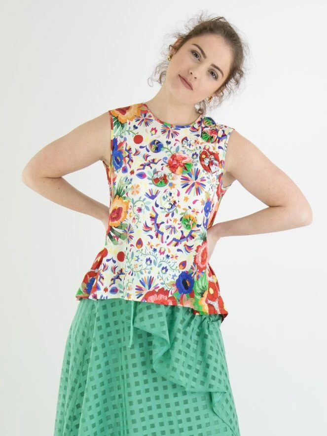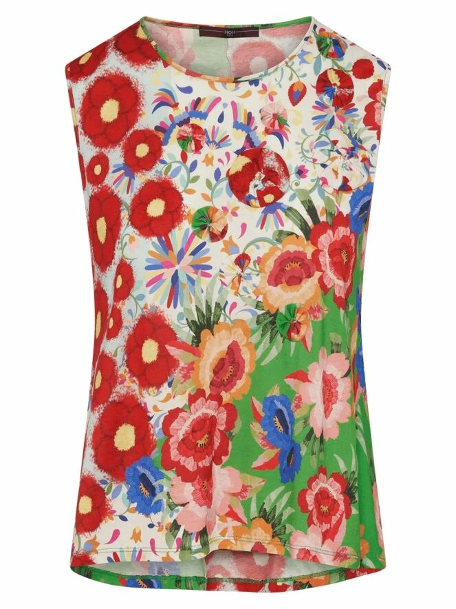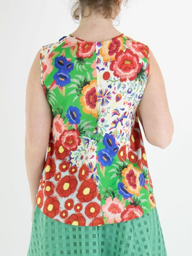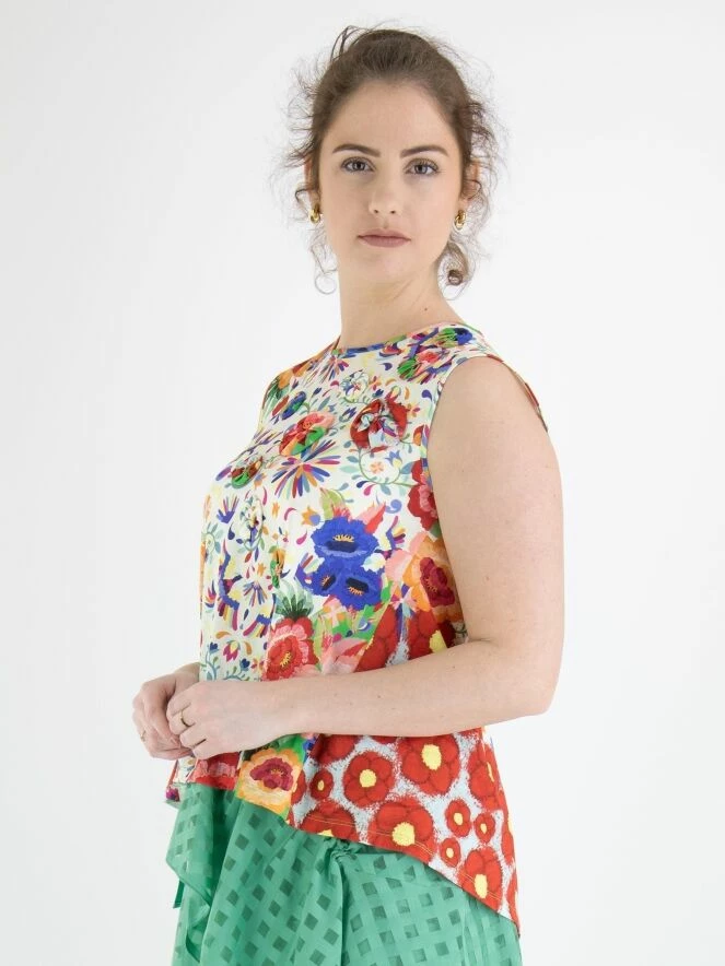 Un top de High avec quatre différents imprimés multicolores. Le top a un col rond et peut être lavé à la main.