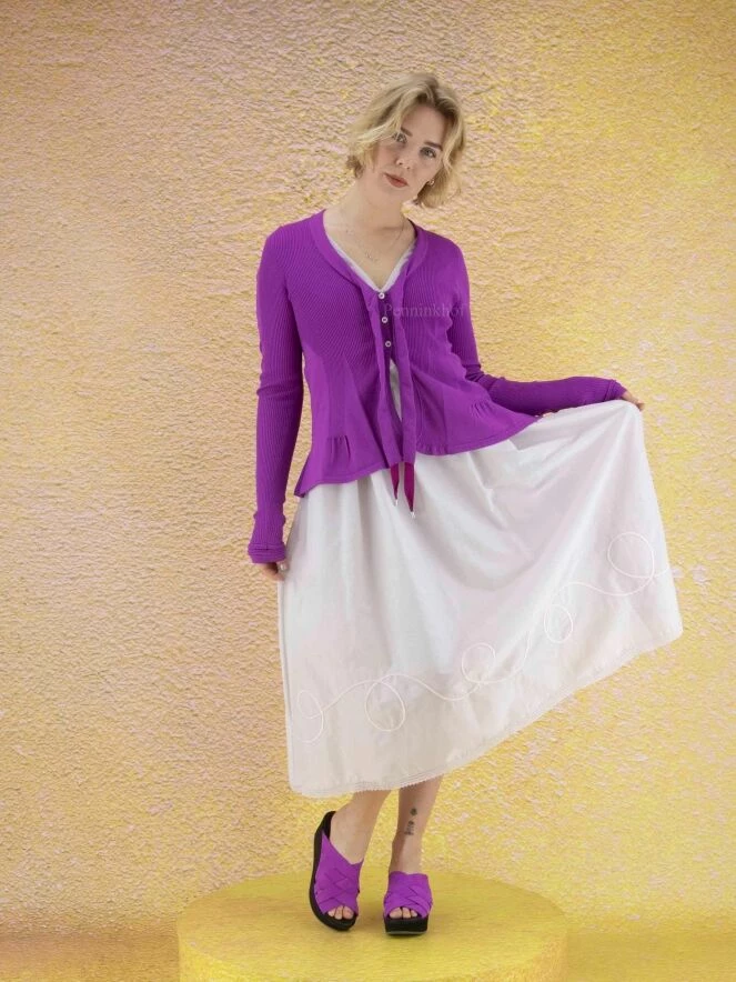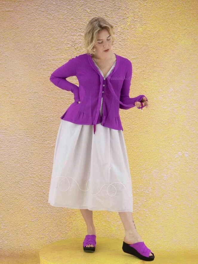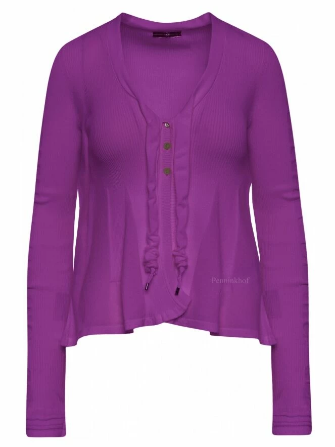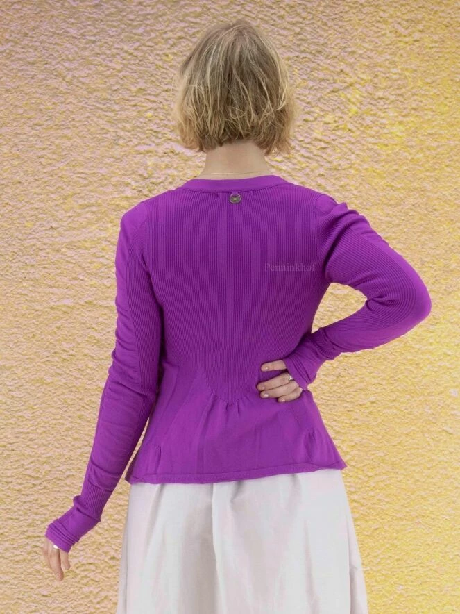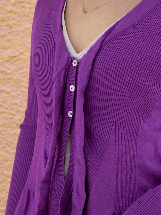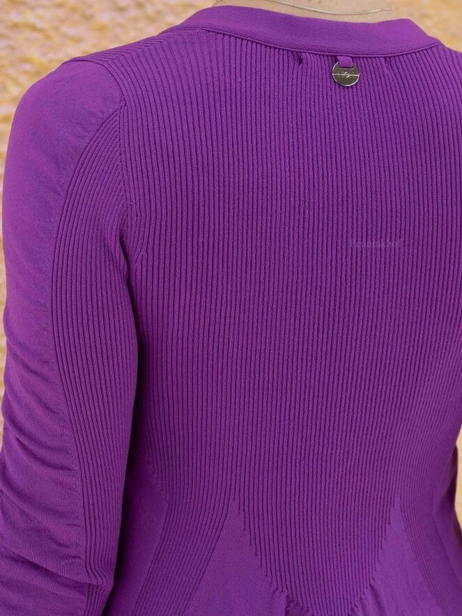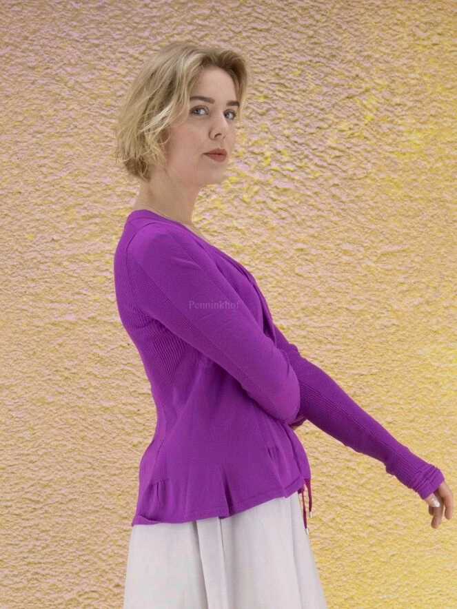 Gilet à manches longues et moulantes, de la marque High, de couleur violette dans une alternance de fines côtes et d’uni. Le gilet présente un col en V prolongé par deux rubans décoratifs aux extrémités en tire-bouchon. À partir de la taille, le gilet prend une ligne A. Lavage à la main.