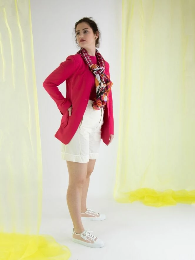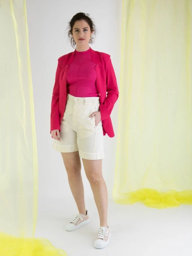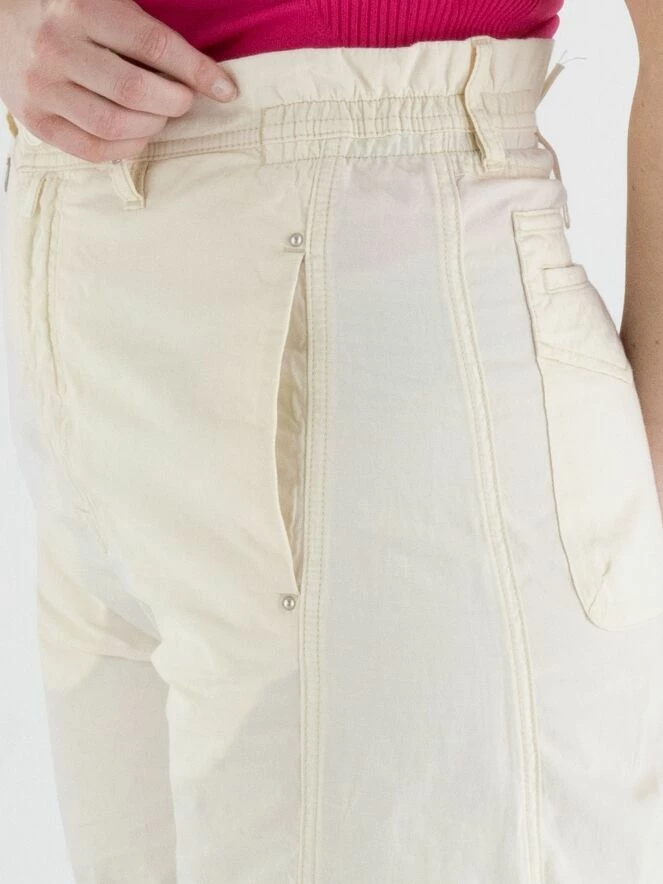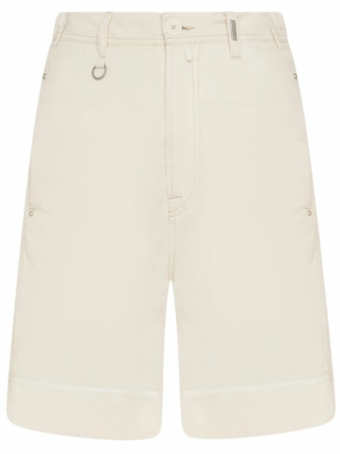 Un bermuda de High de couleur vanille. Il y a une bande blanche plusieurs centimètres au-dessus de l’ourlet. Le bermuda a des poches plaquées et doit être lavé à la main.