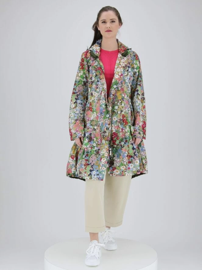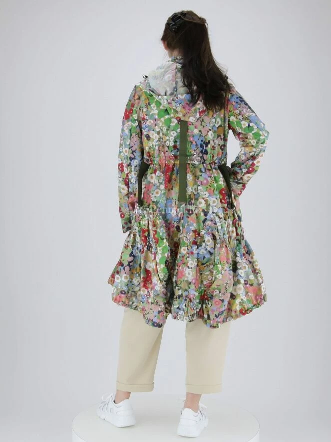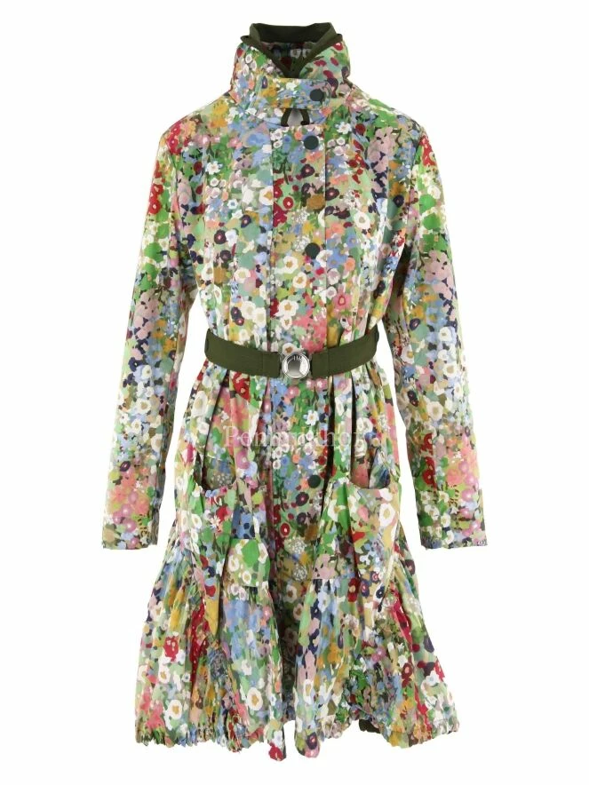 Parka longue de la marque High, Ă imprimĂ© floral multicolore aux multiples nuances de vert, bleu, blanc crème et rouge. Le col entonnoir ferme Ă l’aide d’une patte Ă bouton pression et est bordĂ© d’une garniture vert olive. A l’avant, la taille est Ă©quipĂ©e d’une ceinture vert olive Ă©lastique dĂ©corative Ă boucle ronde de couleur argentĂ©e. Dans le dos, la taille prĂ©sente un cordon Ă©lastique sous tunnel. Le dos est ornĂ© d’une bande centrale verticale vert olive qui s’arrĂŞte en dessous de la taille. La parka est munie de poches horizontales Ă bords finement froncĂ©s sur les cĂ´tĂ©s d’oĂą partent des plis multiples qui crĂ©ent du volume sur la jupe et une sĂ©rie de coutures courbes qui crĂ©ent des drapages latĂ©raux. Non doublĂ©, lavage Ă 30 degrĂ©s.