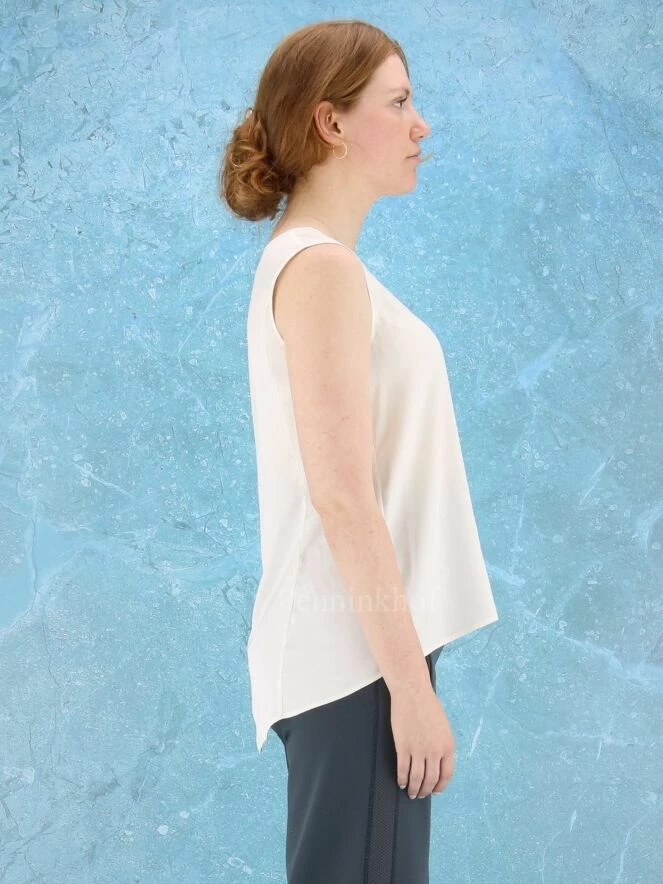 Top sans manches de la marque High, de couleur écrue. Le top présente un col arrondi et une coupe légèrement en ligne A. Le col rond et les emmanchures sont bordés d’un liseré satiné. La base arrondie est plus longue dans le dos. Lavage à la main.