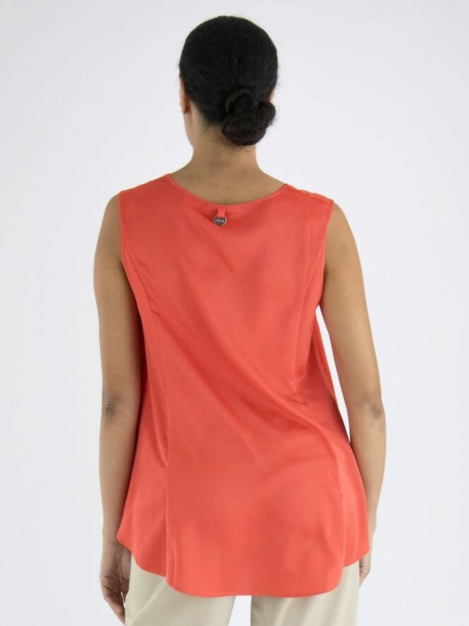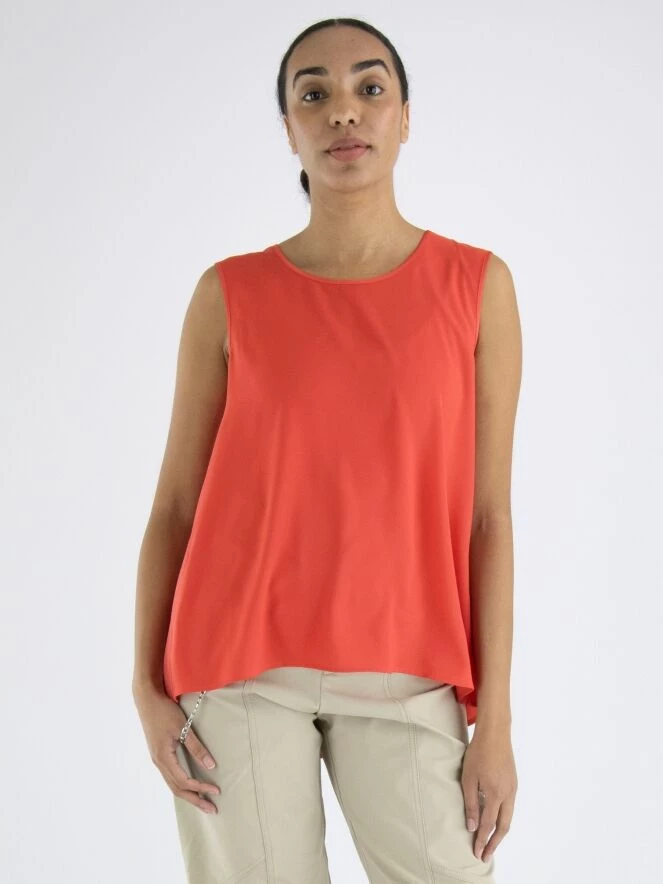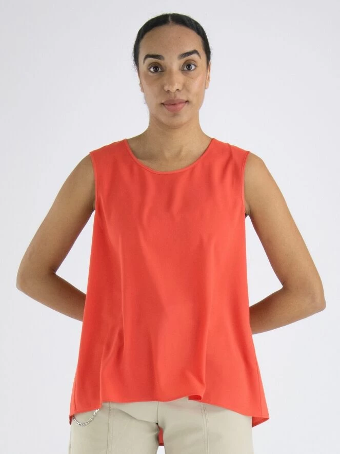 Un top de High en rouge corail. Le top a un col rond et une légère forme en A. Le devant est mat et l’arrière est en satin mat. Ce top peut être lavé à la main.