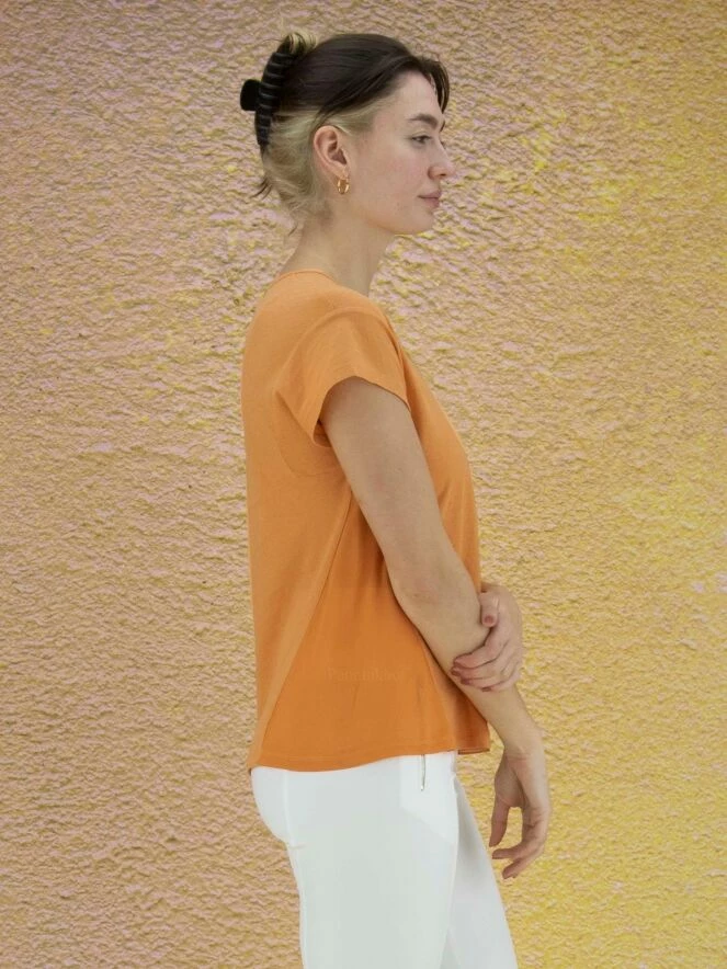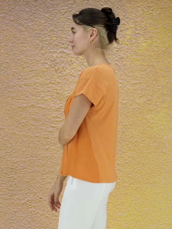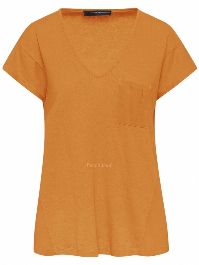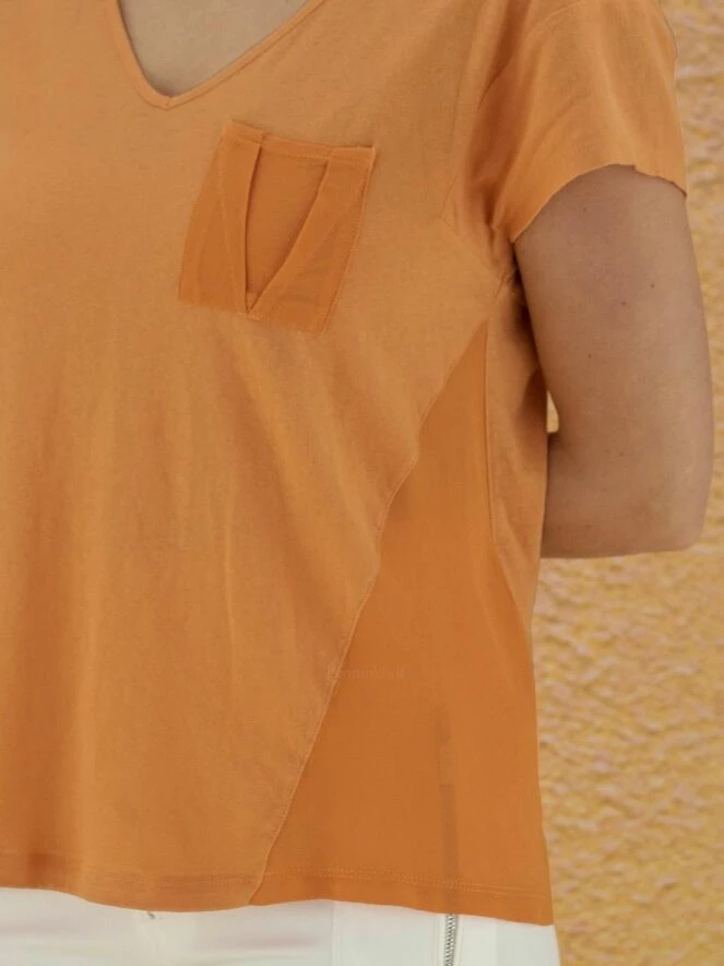 Tee-shirt à col en V de la marque High, de couleur orange. Le tee-shirt présente une poche poitrine en tissu crêpe légèrement transparent avec des plis diagonaux. Lavage à la main.