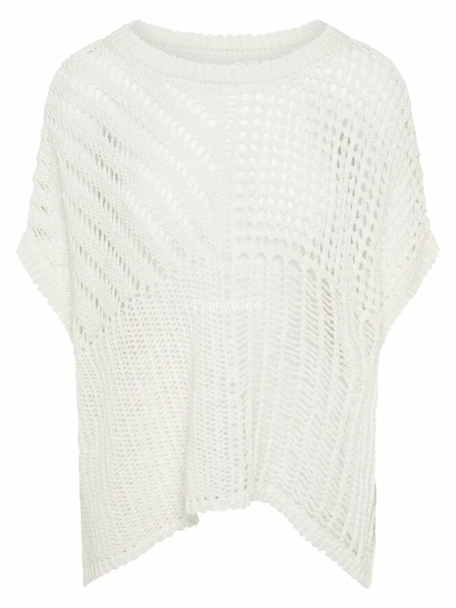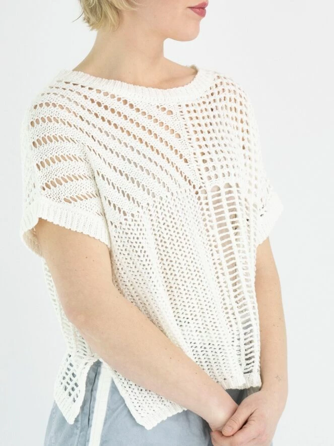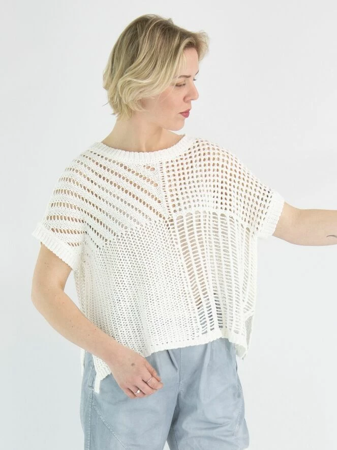 Un haut ou un gilet ouvert au crochet en blanc crème. Le haut est crocheté en quatre motifs différents et peut être lavé à la main.