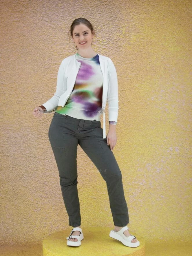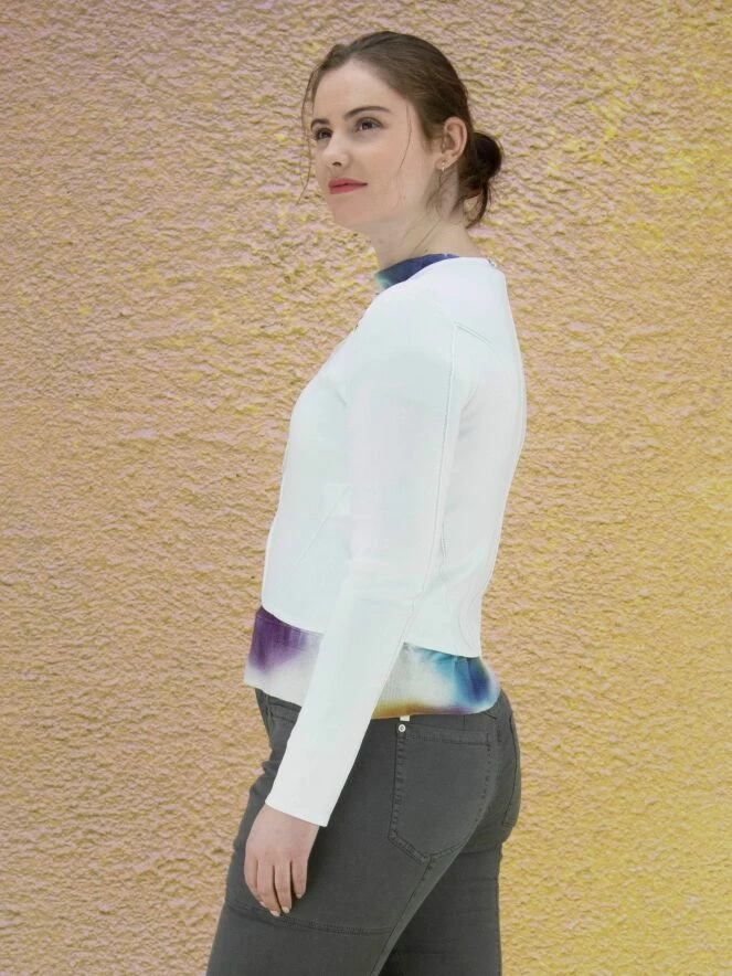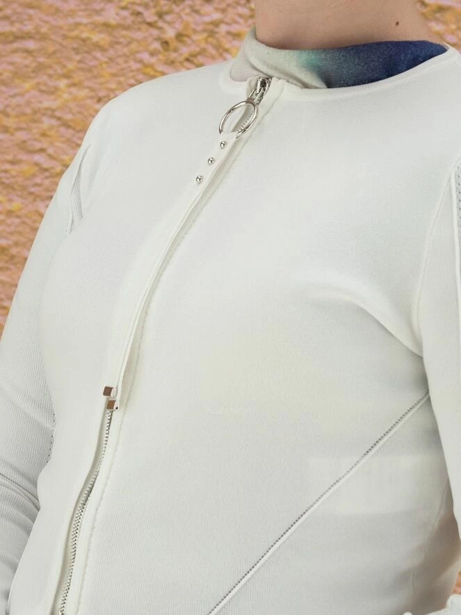 Gilet court à col rond de la marque High, de couleur blanche. Le cardigan est équipé d’une fermeture Eclair argentée avec une longue tirette en ruban ornée d’extrémités argentées. Des coutures en relief ornent les manches et la partie basse du gilet. Lavage à la main.