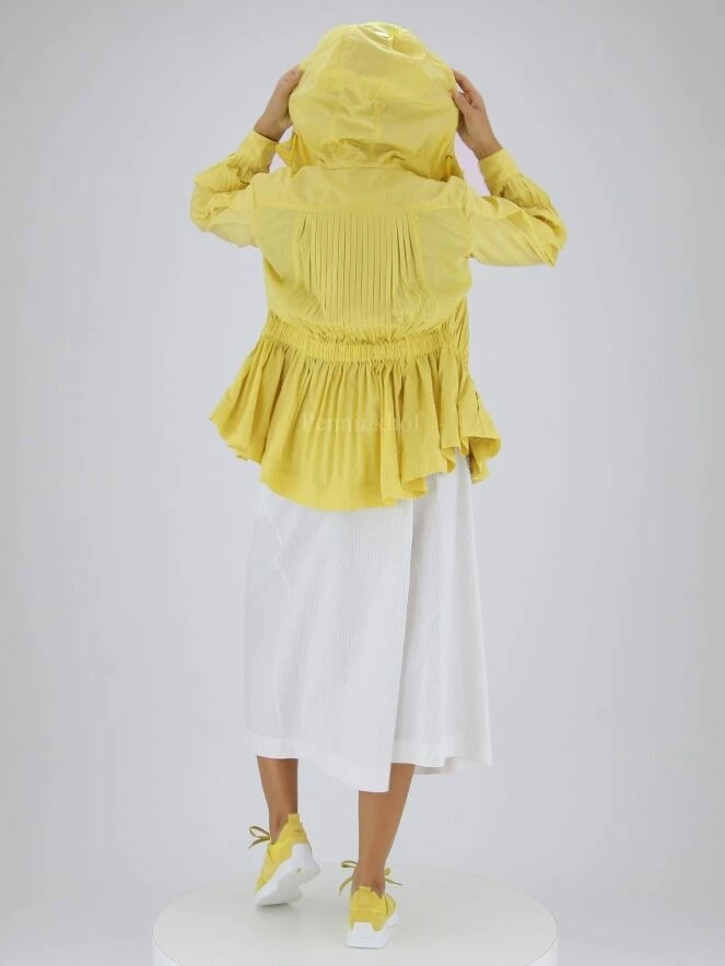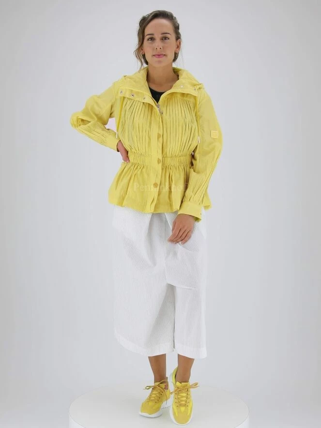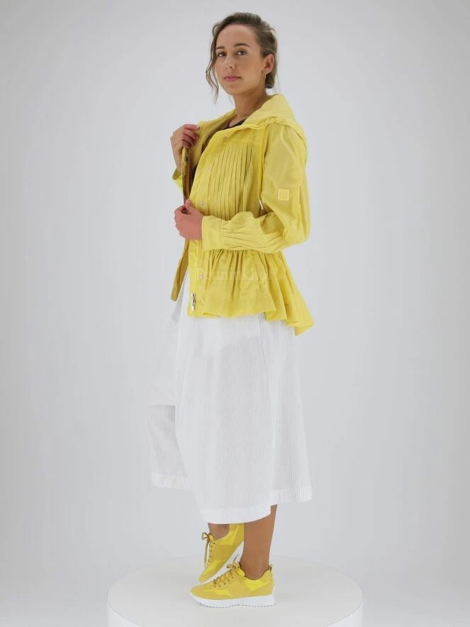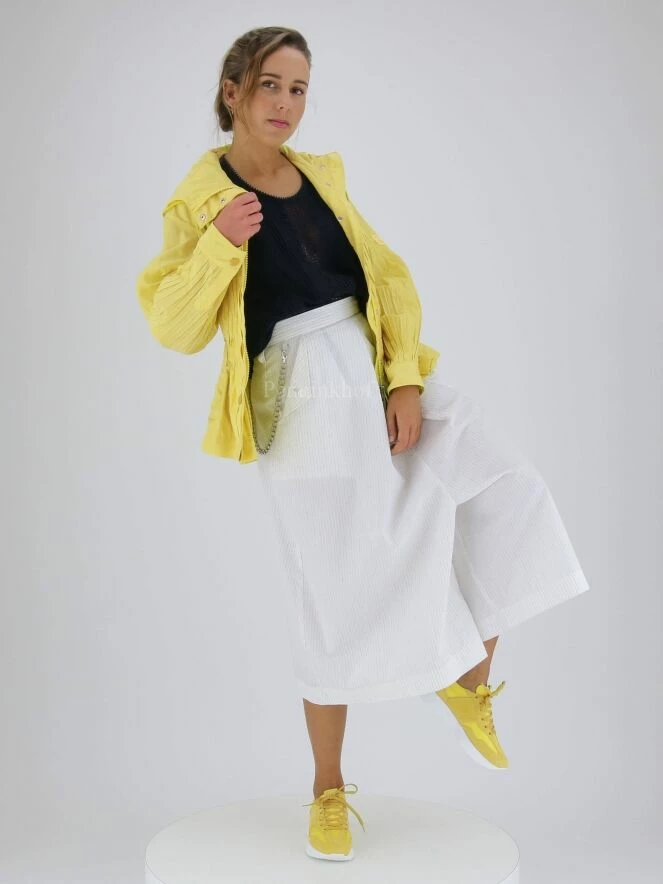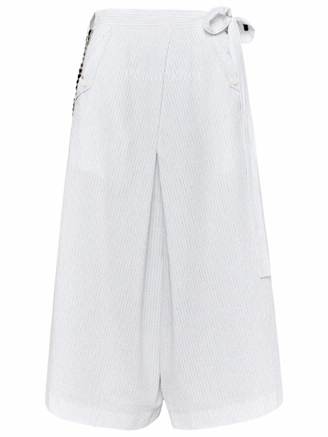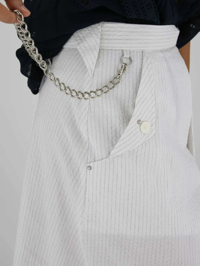 Jupe pantalon de la marque High, en seersucker à rayures gris clair sur un fond blanc. Les poches latérales présentent un revers en pointe à bouton. A l’avant sous la taille, un profond pli central crée du volume. Le côté droit est orné d’une chaîne amovible de couleur argentée. Le côté gauche est orné de deux rubans à la taille qui permettent un joli nÅ“ud décoratif. Lavage à 30 degrés.