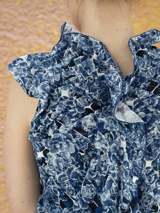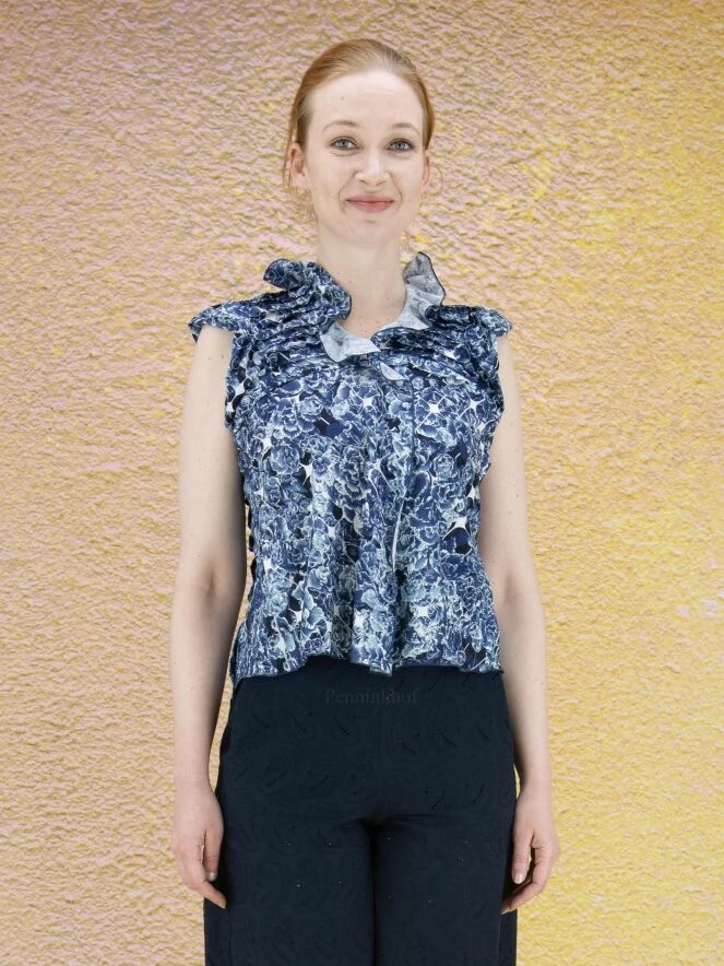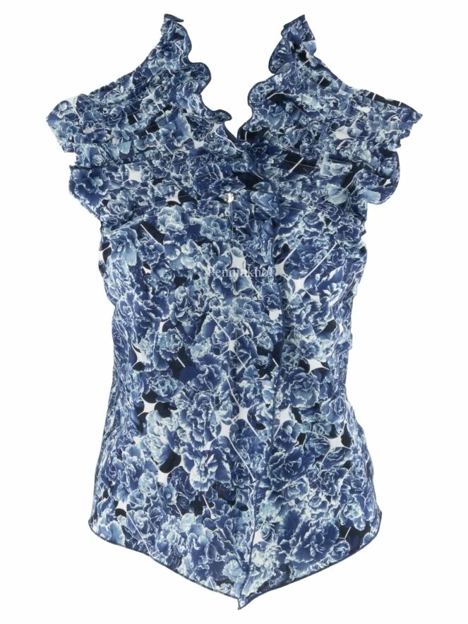 Top sans manches de la marque High, à l’imprimé floral aux multiples nuances de bleu et de blanc crème. Ce top est agrémenté de multiples volants. Des plis plats horizontaux ornent les épaules en descendant vers l’avant et l’arrière. Le col est en V sur le devant et dans le dos. Une fente centrale est présente sur le devant et dans le dos. Lavage à la main.