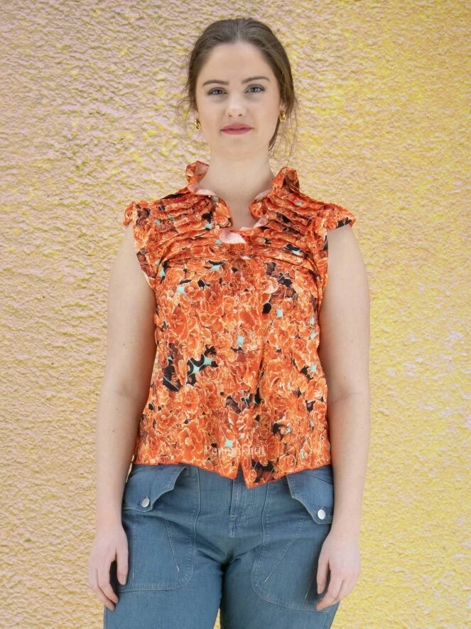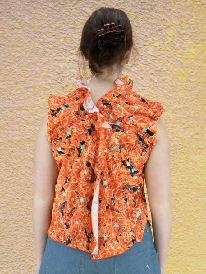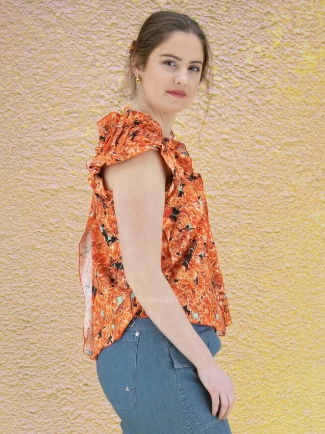 Top sans manches de la marque High, à l’imprimé floral aux multiples nuances d’orange et de blanc crème. Ce top est agrémenté de multiples volants. Des plis plats horizontaux ornent les épaules en descendant vers l’avant et l’arrière. Le col est en V sur le devant et dans le dos. Une fente centrale est présente sur le devant et dans le dos. Lavage à la main.