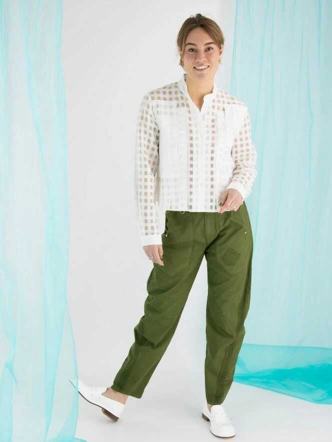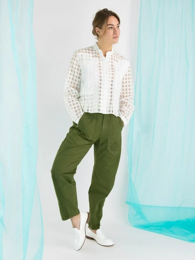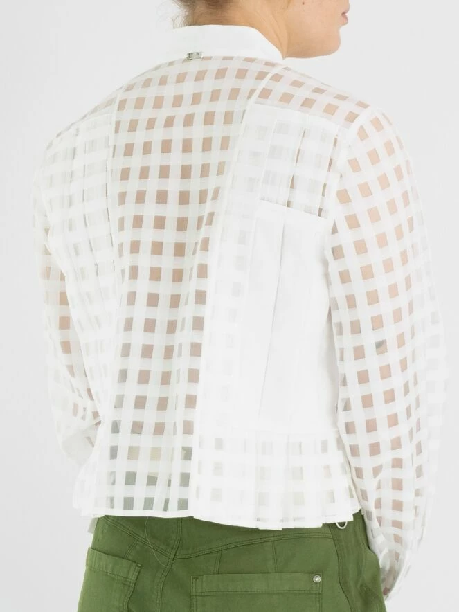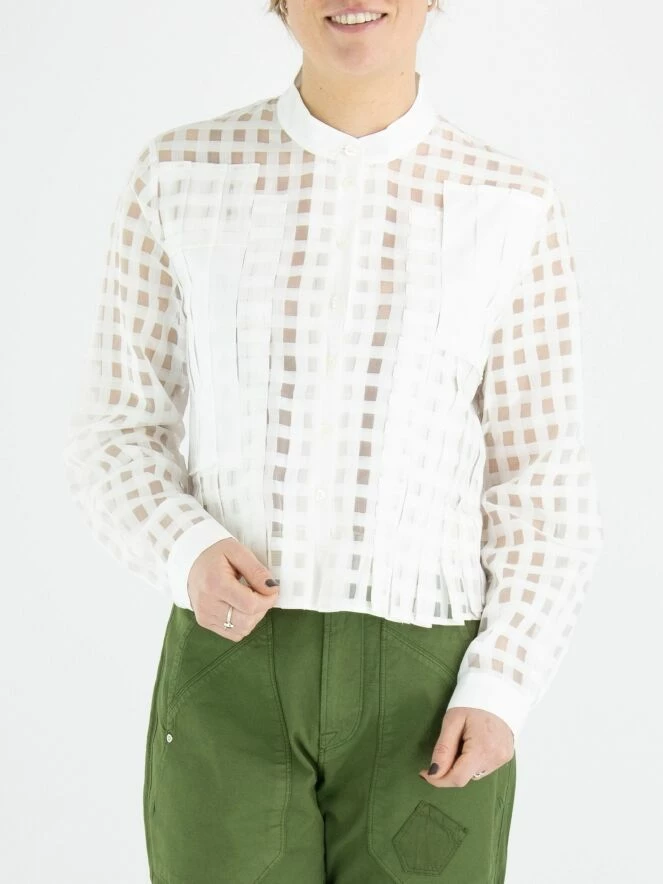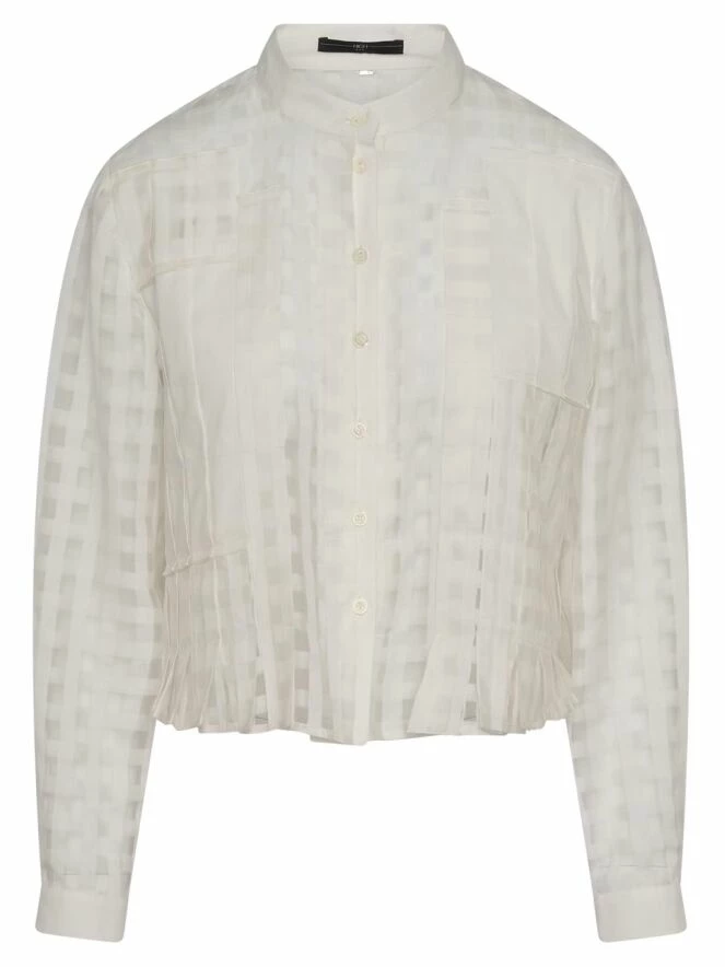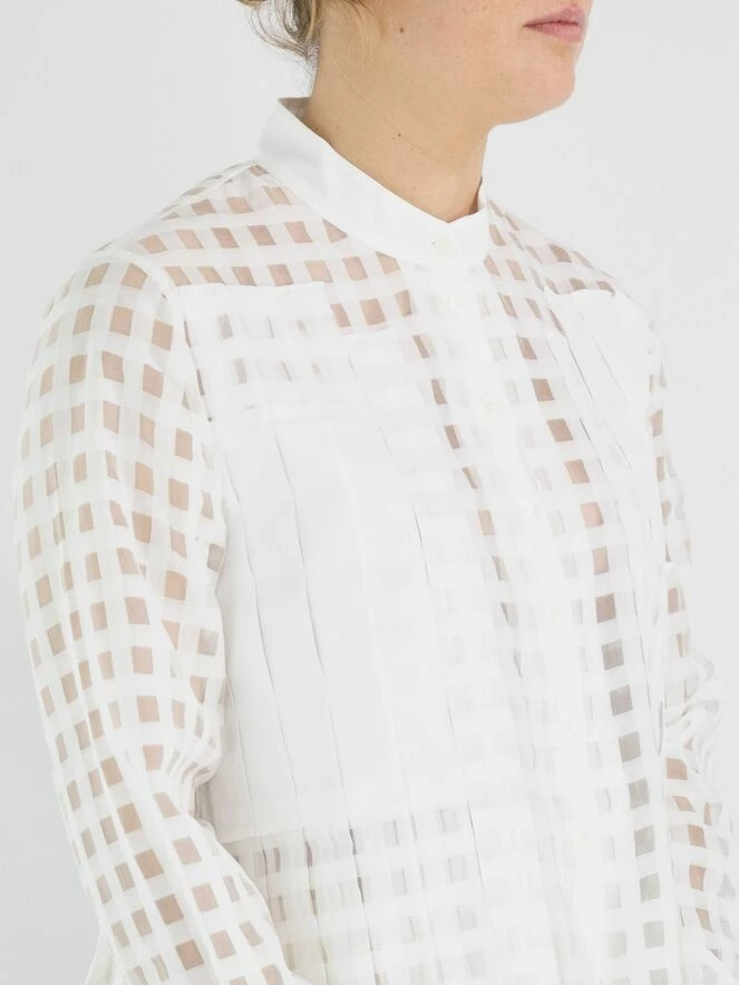 Une blouse légèrement transparente de High avec plusieurs motifs en bloc en blanc. Cette blouse ne doit pas être lavée.