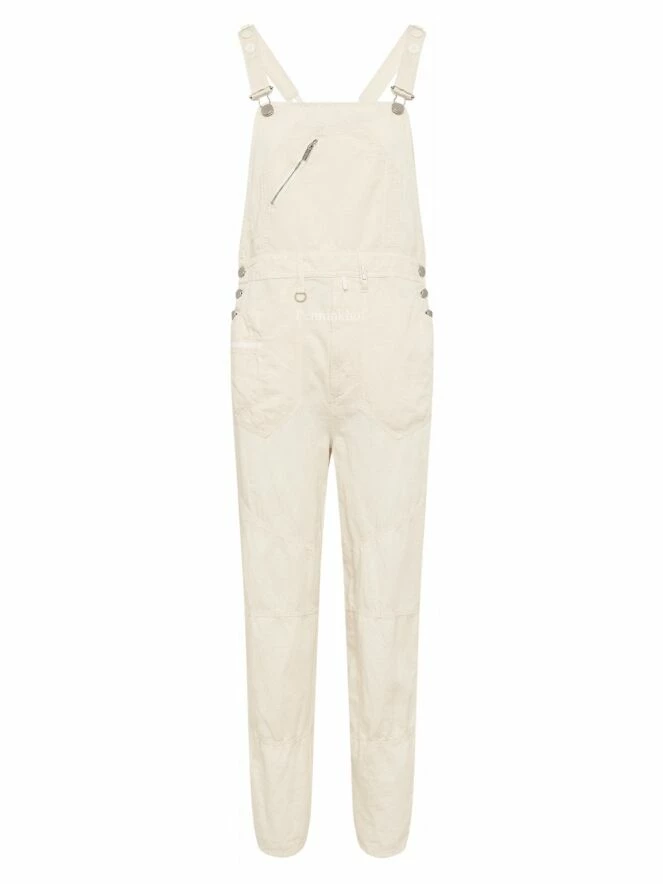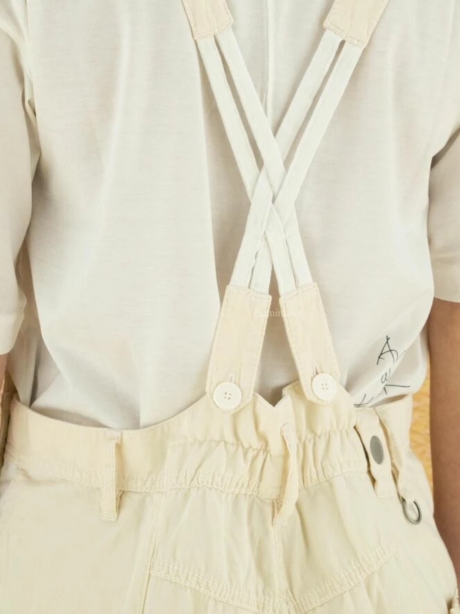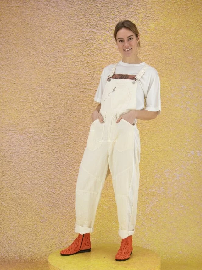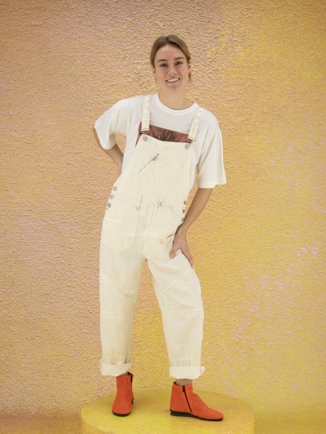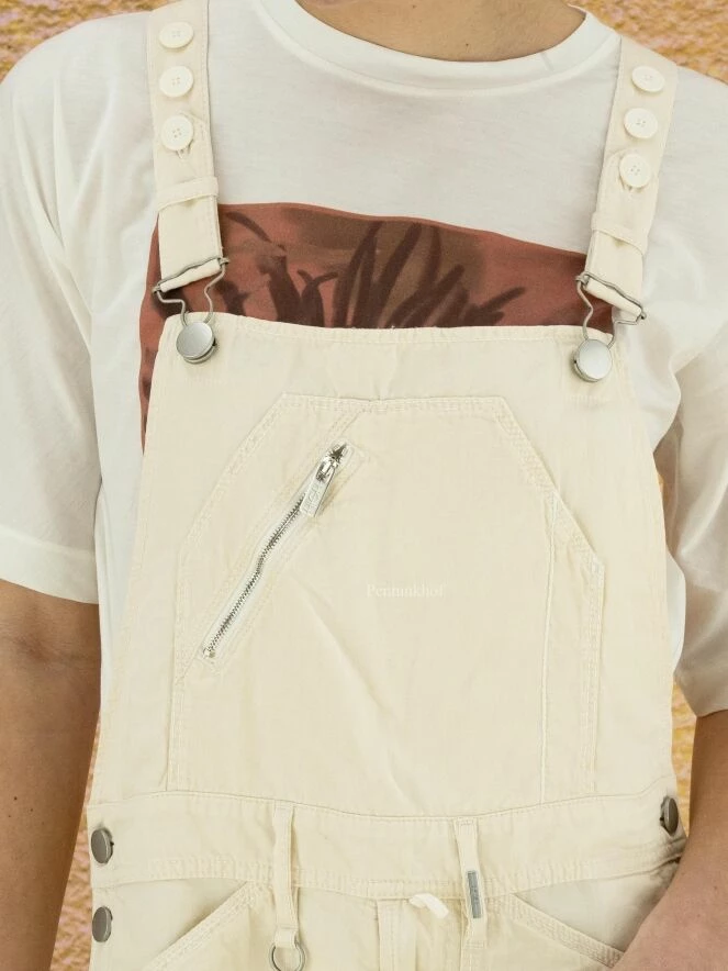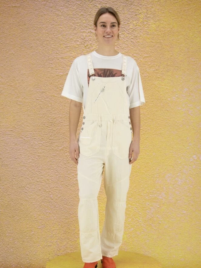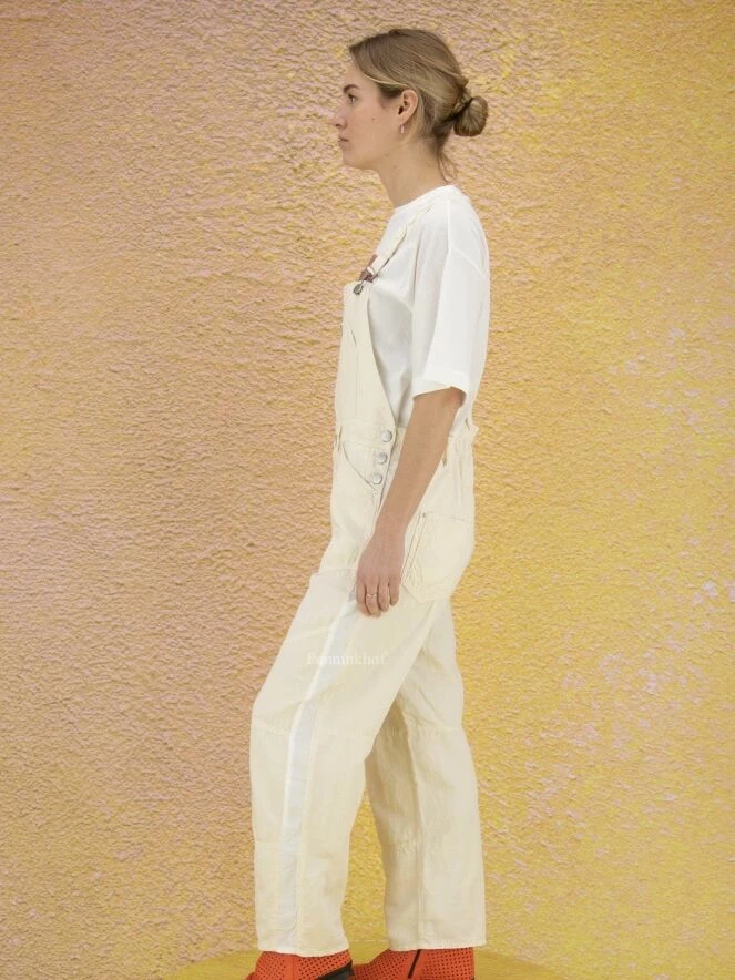 Salopette de la marque High, de couleur blanc crème. Les bretelles qui se croisent dans le dos sont ornées de boutons blancs sur le dessus. Des boutons en nickel ferment les côtés au niveau de la hanche. La salopette est équipée de poches latérales. Lavage à la main.