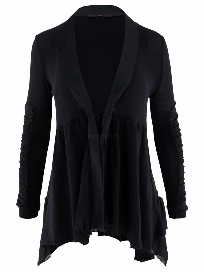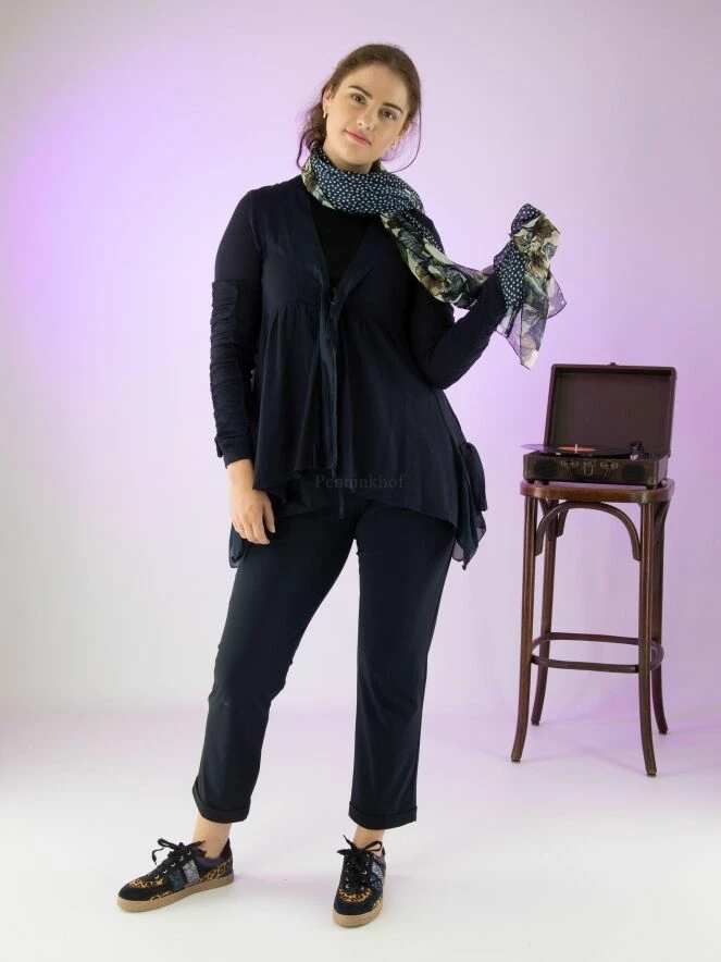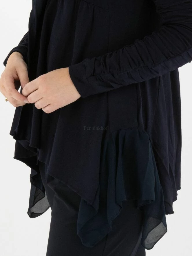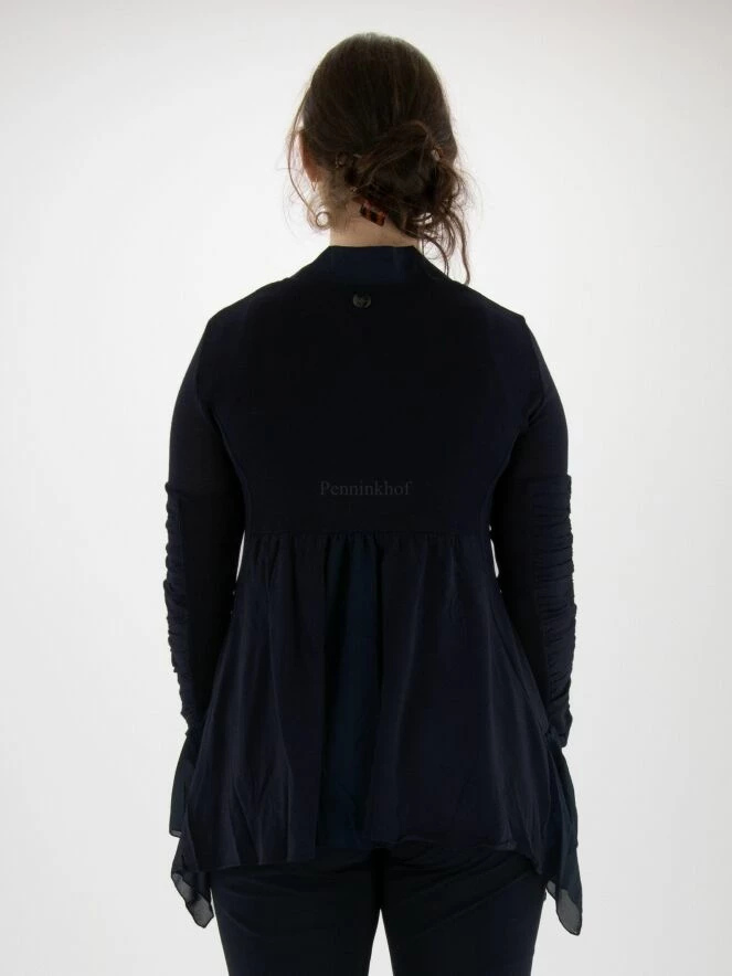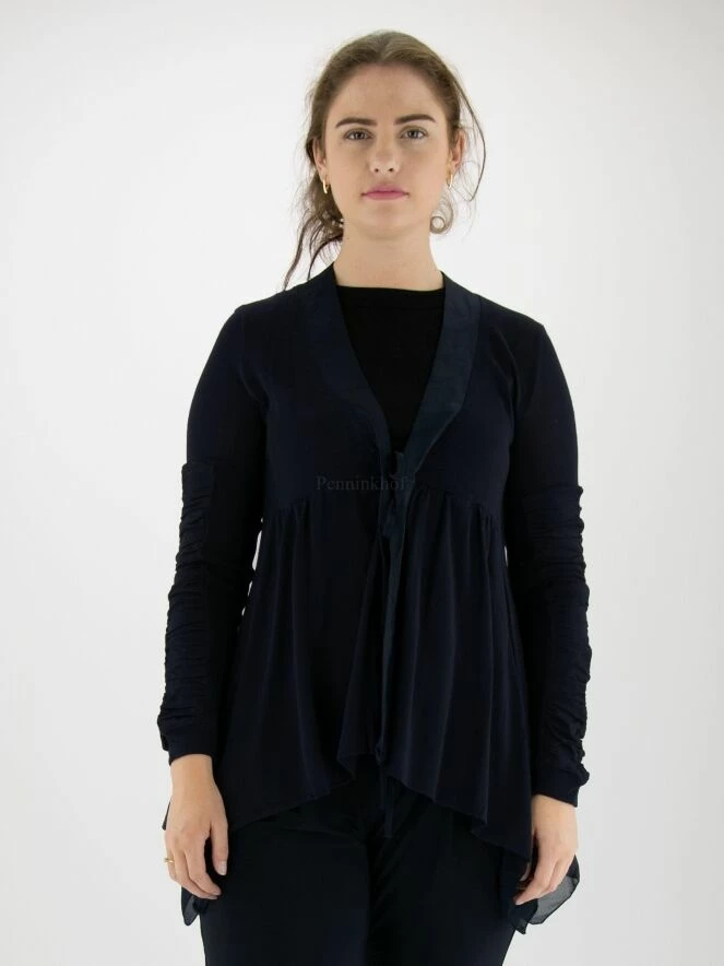 Gilet sans fermeture de la marque High, dans un tissu côtelé très fin de couleur bleu marine. L’encolure en V est bordée d’une bande de satin mat. Sous le buste, une couture surpiquée permet de plisser délicatement le tissu. La fermeture est assurée par un cordon de serrage. Le bas du gilet est en voile de chaque côté. A partir du haut du bras, les manches longues sont composées de deux tissus, l’un finement côtelé et l’autre finement plissé. L’ourlet est asymétrique, plus bas sur les côtés. Lavage à la main.