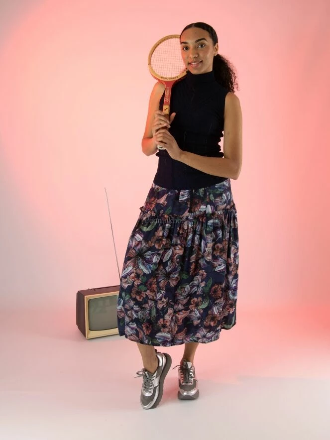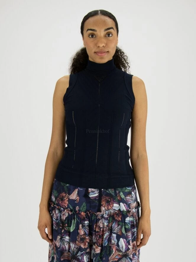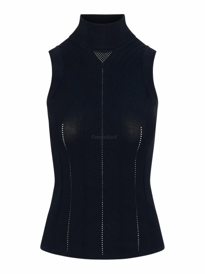 Top sans manches et col roulé de la marque High, de couleur bleu marine. Le top présente de multiples textures en forme de V et quelques perforations ajourées verticales. Les panneaux latéraux sont à maille côtelée. Le dos est identique au devant. Lavage à la main.