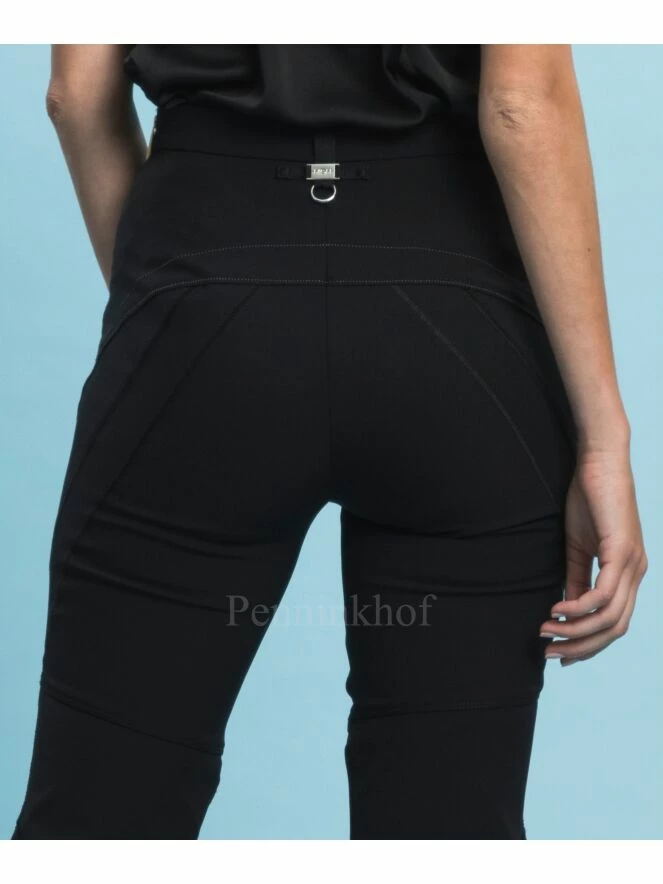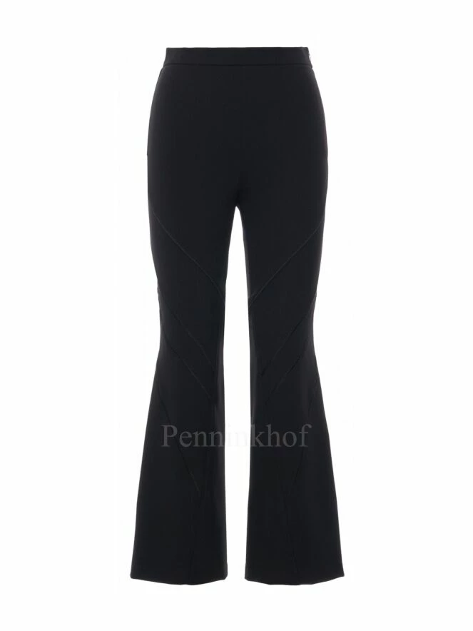 Pantalon ajusté en forme de cloche, de la marque High, de couleur noire. La jambe est ornée d’une couture diagonale sur le devant avec surpiqûres contrastées et de 3 autres coutures diagonales en satin. La fermeture du pantalon se fait par un zip sur le côté gauche. Lavage à la main.