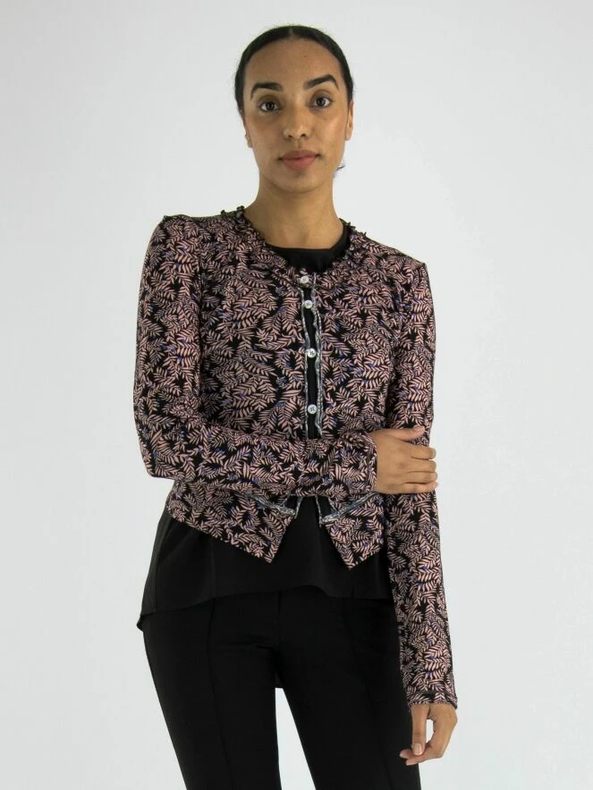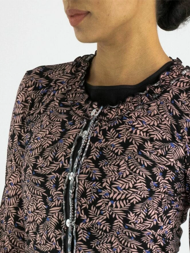 Un cardigan court de High avec un imprimé de fougères en rose et bleu sur un fond noir. Le long de la fermeture à boutons se trouve une bordure noire. Le tissu autour du col rond est double et finement plissé. En bas, il y a une bordure en vert olive et blanc. Ce cardigan peut être lavé à la main.
