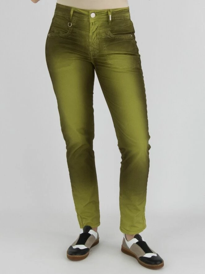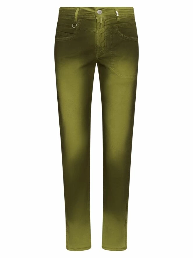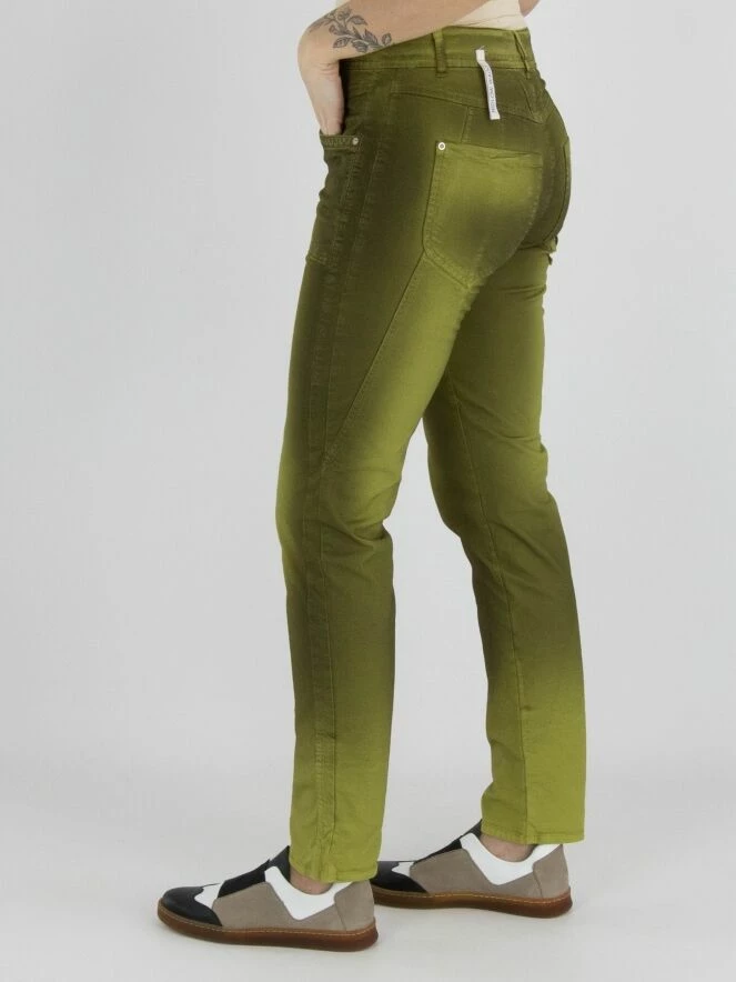 Un jeans lavé de chez High dans des tons verts pistache, avec des nuances plus claires sur les cuisses et en bas des jambes. Le jeans est de style 5 poches et doit être lavé à la main.