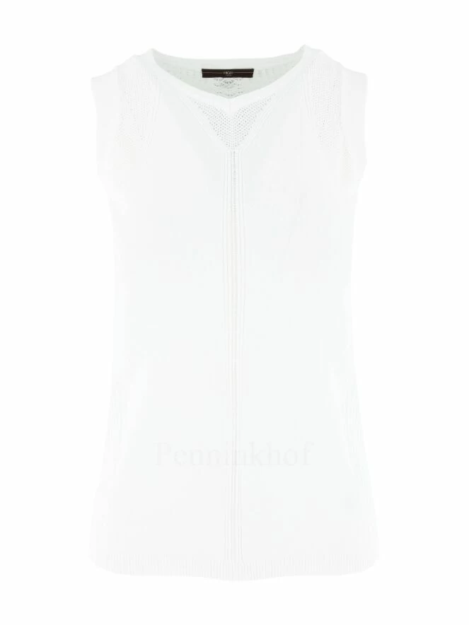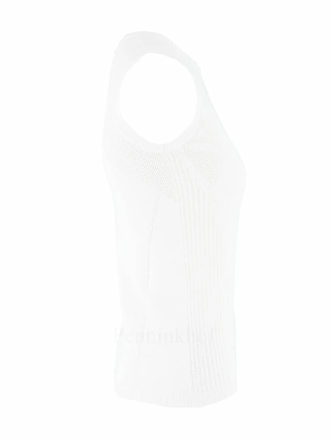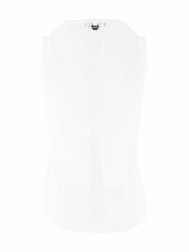 Long débardeur sportif de la marque High, de couleur blanc. Il est doté d’un haut col légèrement en V et un tour de cou en petites côtes souples. Une ligne adhérente orne toute la hauteur du buste avec ajout en petite côte perforée latérale. Sur l’arrière, des ajouts verticaux centraux parcourent du cou à l’ourlet en maille effet dentelle perforé. Lavage à la main.