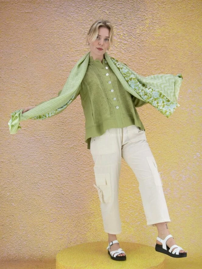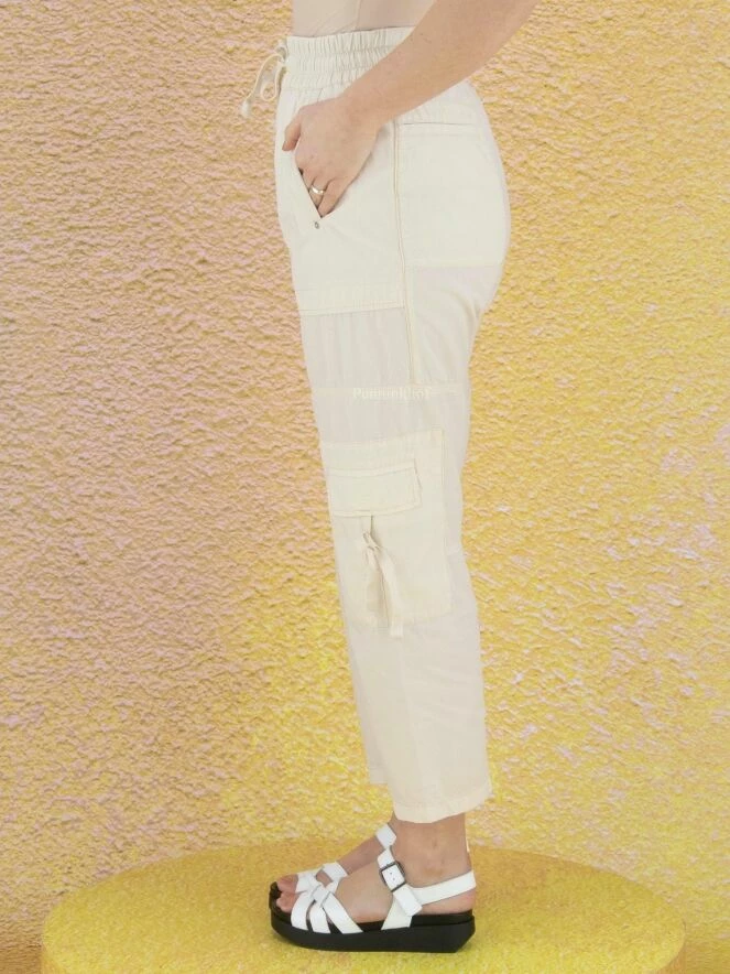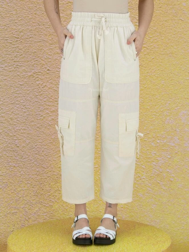 Pantalon cargo de la marque High, de couleur blanc crème. La taille est équipée d’une bande élastique froncée avec un cordon de serrage sous tunnel. Les poches oversize plaquées sur le devant ont une ouverture passepoilée latérale bordée d’un ruban. Deux autres poches au niveau du genou sont à rabat avec un ruban noué. Lavage à la main.