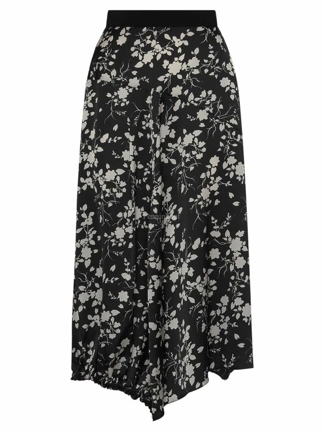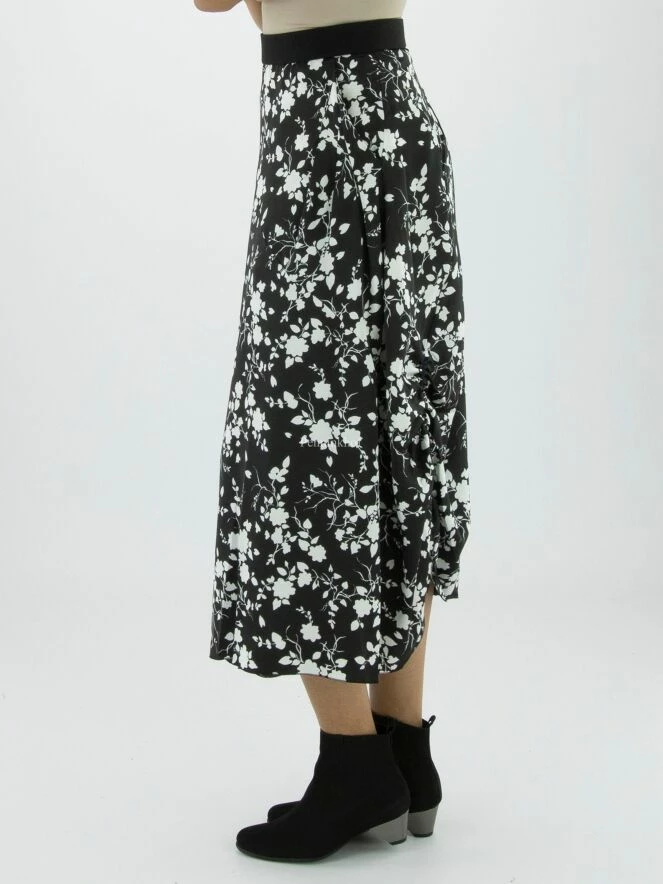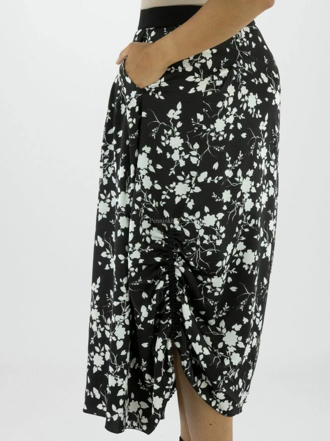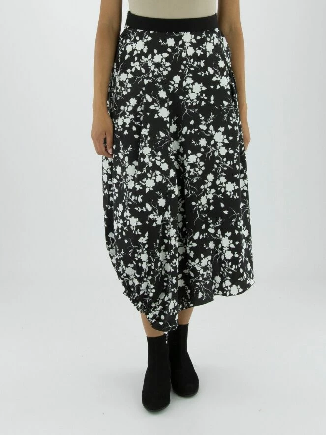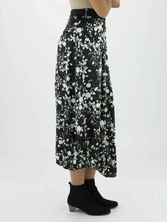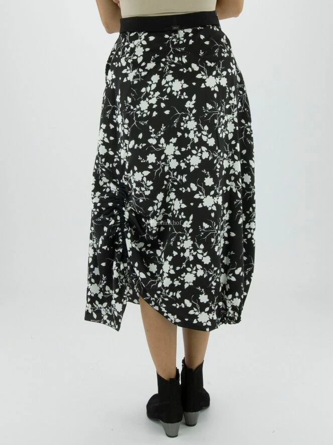 Jupe de High à l’imprimé floral graphique aux couleurs bleu marine et blanc. La taille est élastiquée. Au dos, sur le côté gauche, une couture verticale à plis fins est réalisée à partir de la hauteur du genou. Sur le côté droit se trouve une fermeture éclair à partir de la taille et sur le côté gauche se trouve une pochette à glissière. Cette jupe peut être lavée à la main.