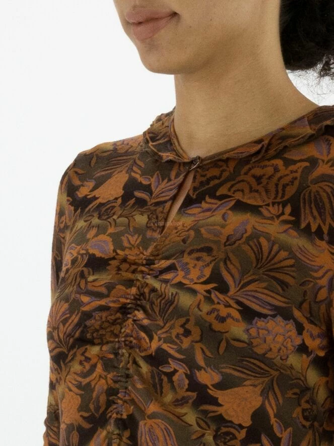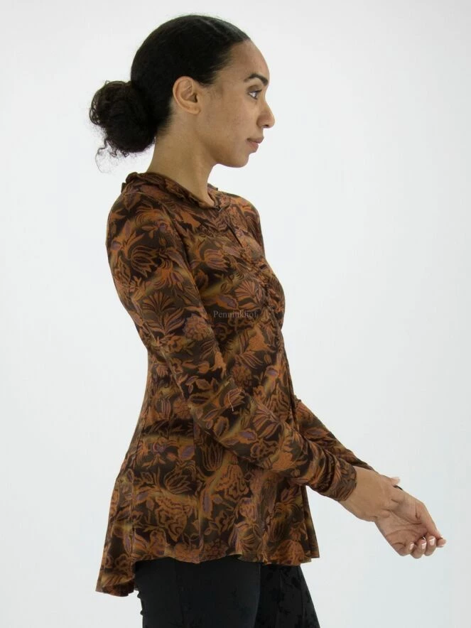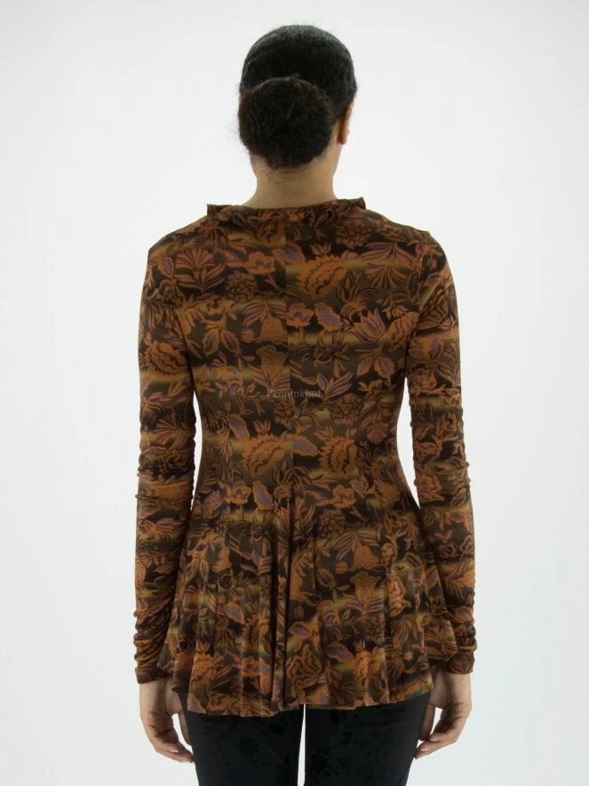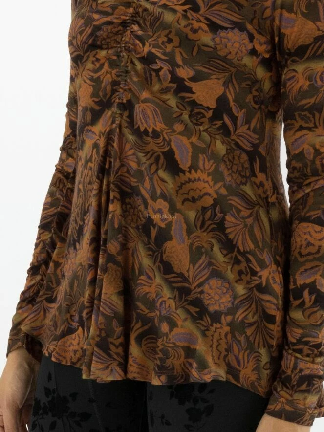Un T shirt de High à l’imprimé floral présentant de multiples nuances de vert et d’orange avec des détails violets. Le T – shirt a un col rond court qui est plissé à quelques endroits. Les coutures au bas des manches longues sont délicatement plissées. À partir de la taille, le T – shirt a une ligne A. Ce T shirt peut être lavé à la main.