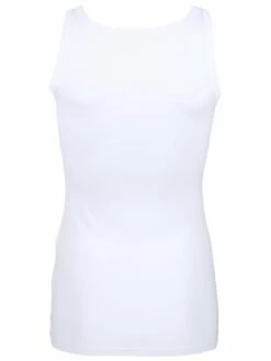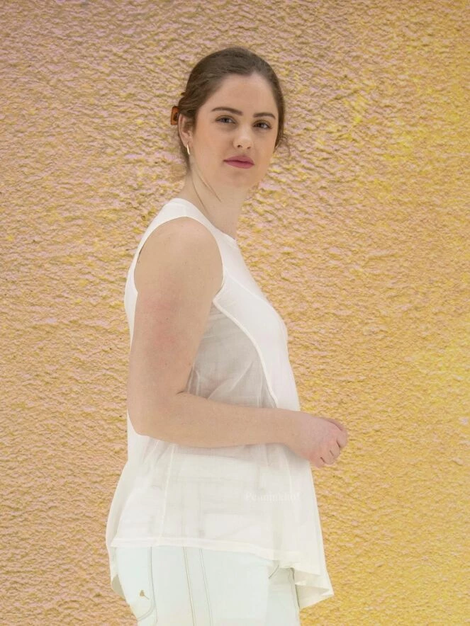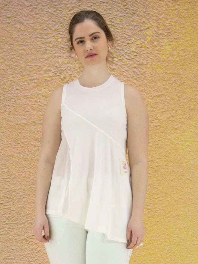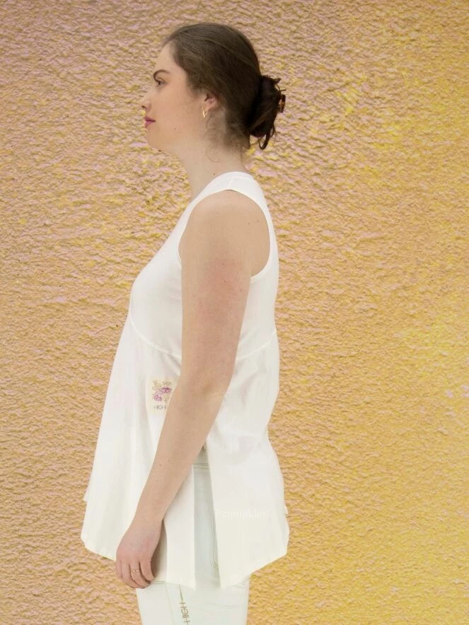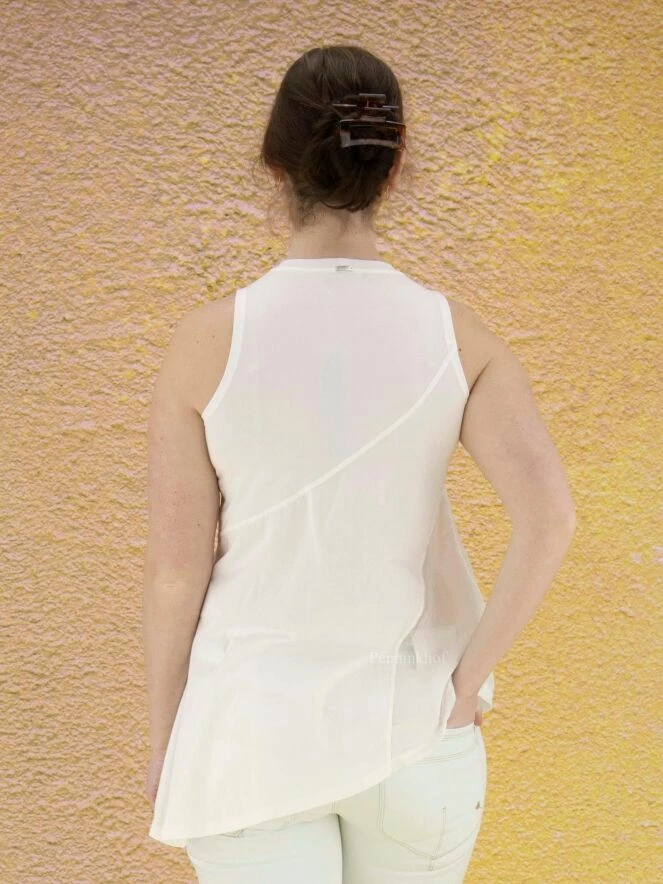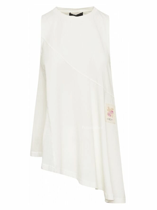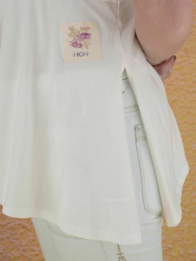 Top à la coupe diagonale de la marque High, de couleur blanc crème. Le côté gauche est légèrement transparent. Le bas du top est coupé en diagonale qui est accentuée par une profonde fente sur le côté droit. Ce top a une ligne A. Le col ras-du-cou et les emmanchures sont bordées de côtes. Lavage à la main.
