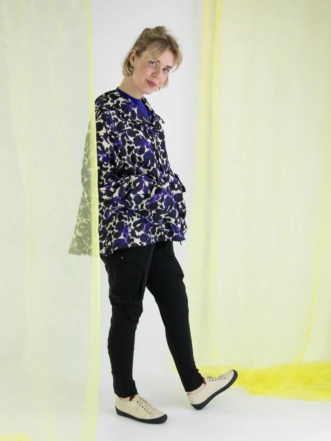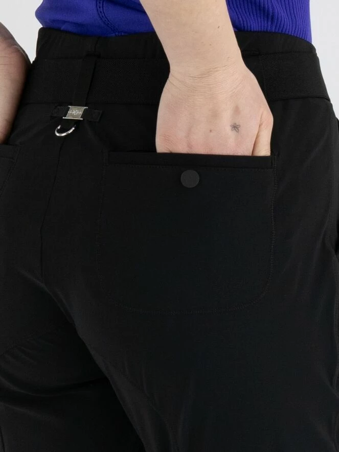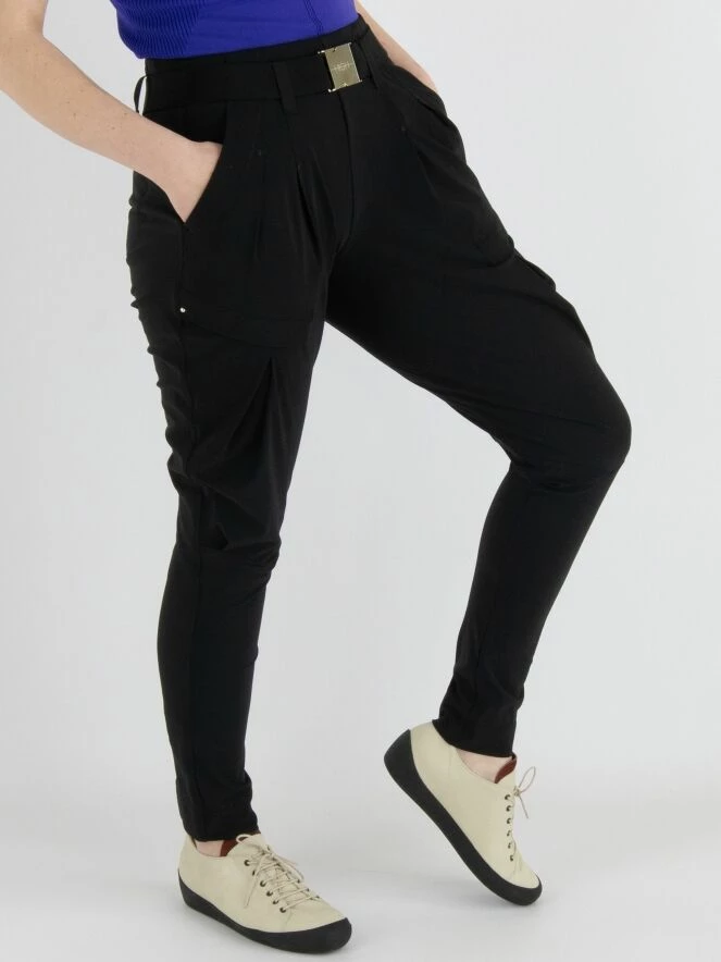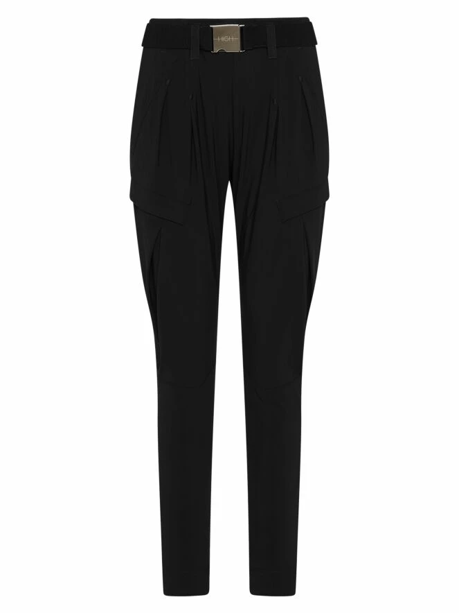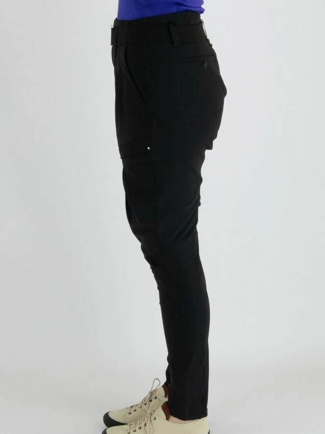 Un pantalon de High de couleur noire. À la taille, il y a une ceinture élastique noire avec une boucle rectangulaire argentée, avec quelques plis sous la ceinture. Il y a un pli sur le côté externe de la cuisse. Sous le genou, à l’arrière, il y a un tissu élastique finement côtelé. Le pantalon a des poches plaquées et doit être lavé à la main.
