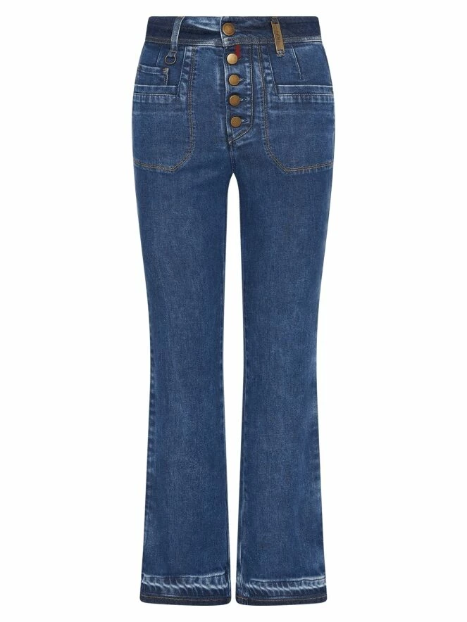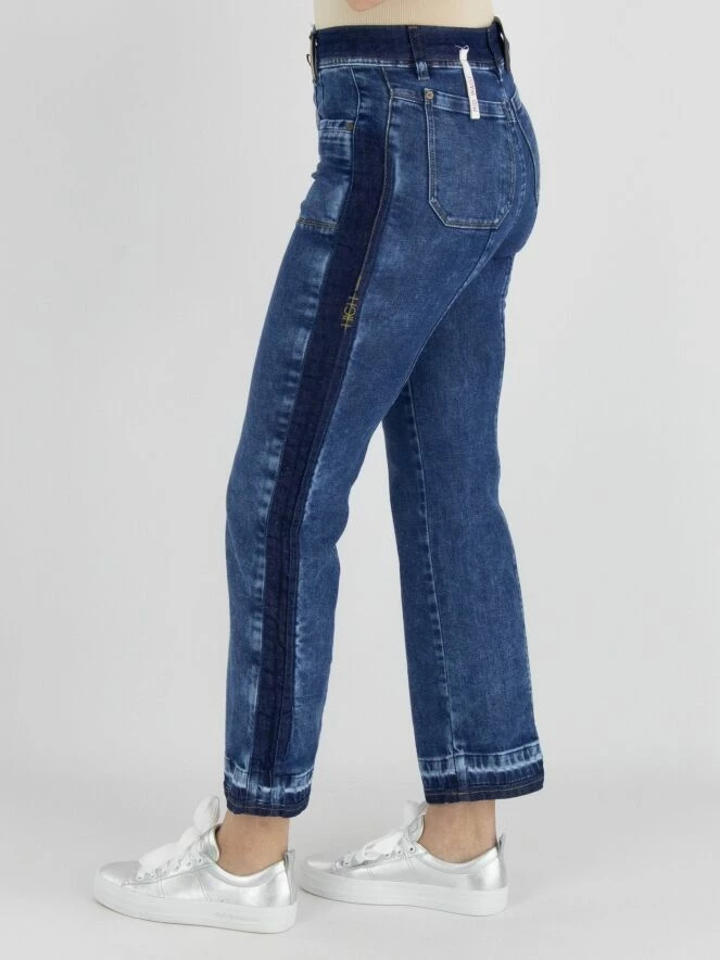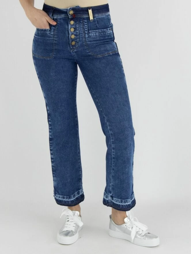 Jean par High dans un bleu denim avec une jambe droite et une fermeture à bouton. Il y a une coloration blanche de type batik au bas des jambes. Le jean est de style 5 poches et peut être lavé à 30 degrés.