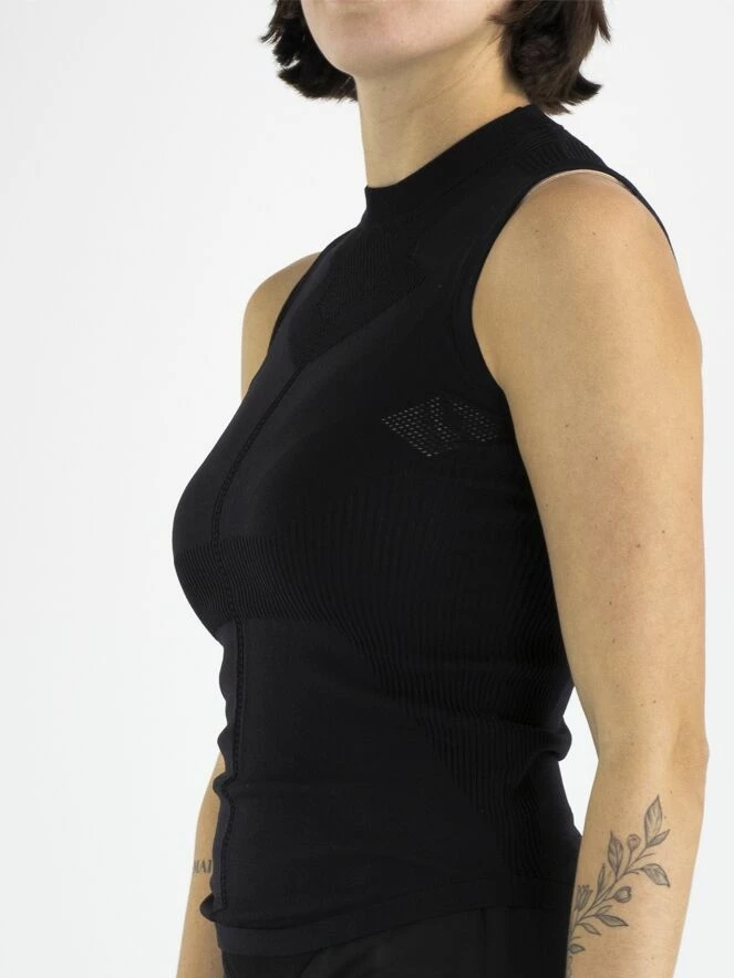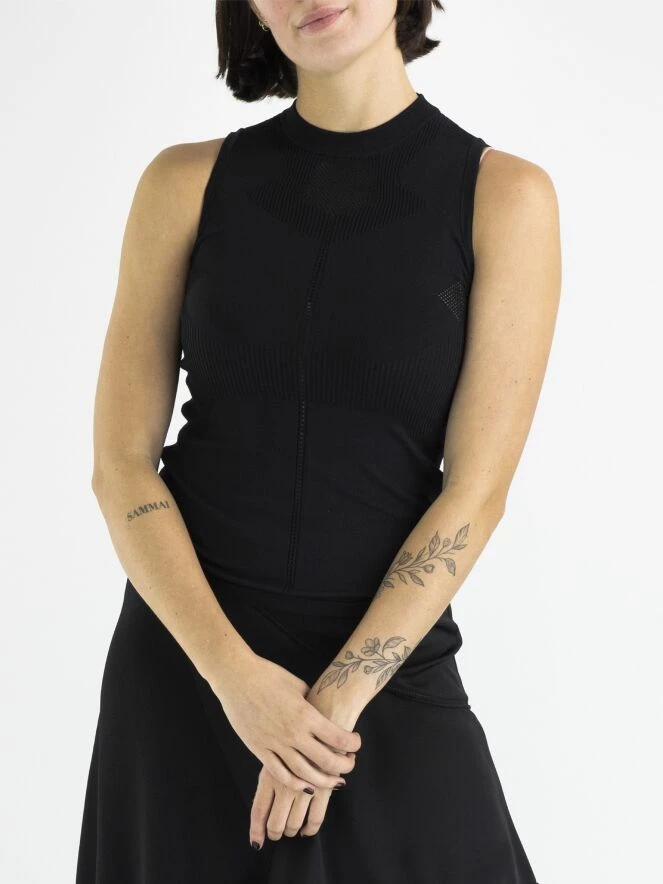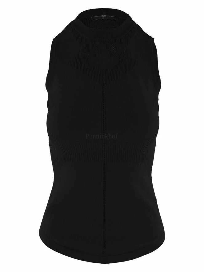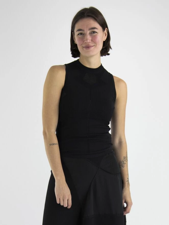Un top de High en noir. Le long du col rond haut et à la taille, il y a un bord en tricot finement côtelé. Au milieu du devant et du dos, il y a une bordure ajourée. Sous les aisselles et en dessous du bord du col, le tissu est finement perforé. Ce top élastique peut être lavé à la main.
