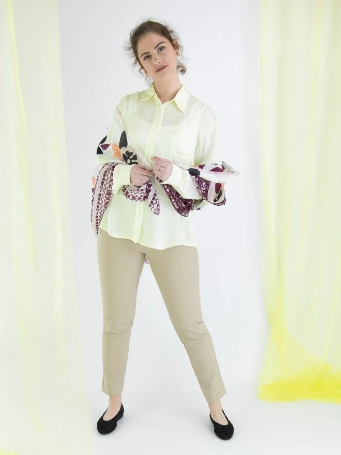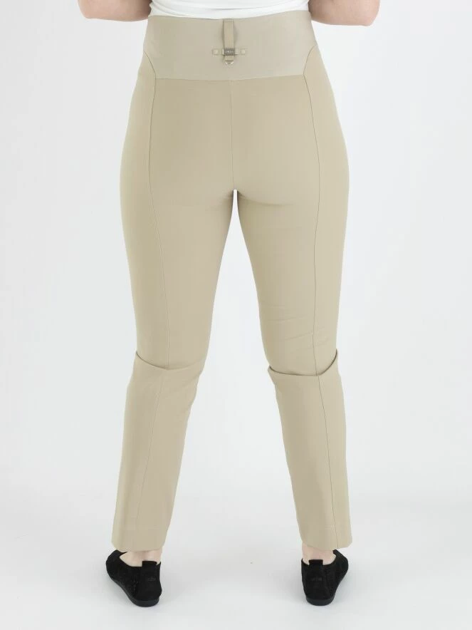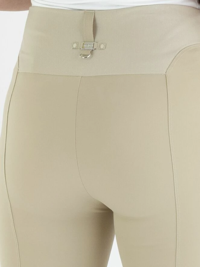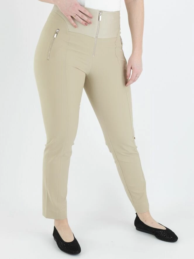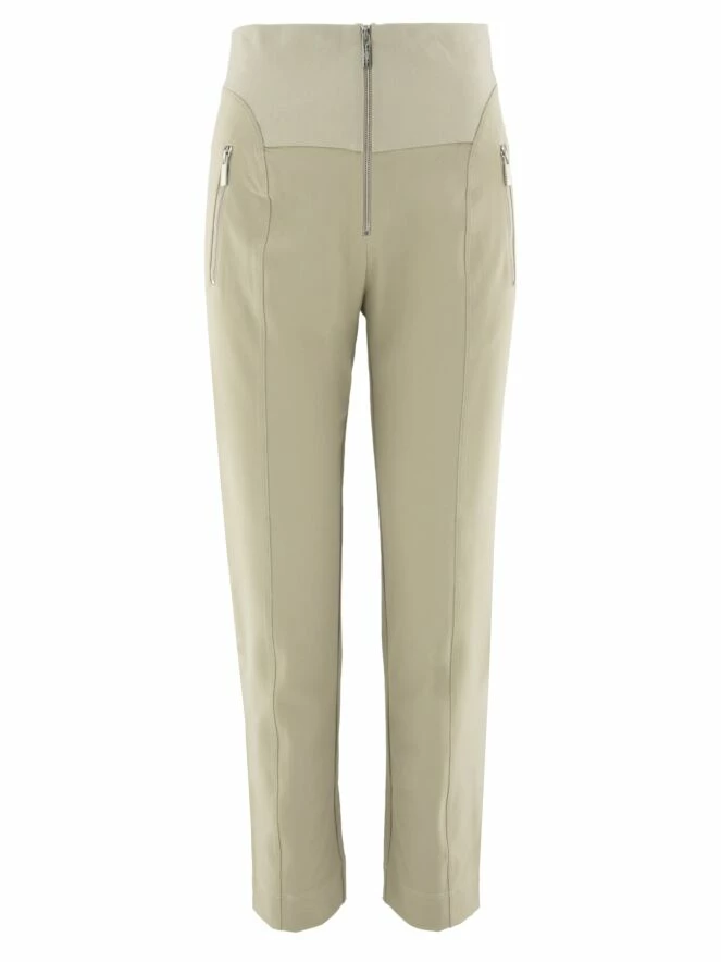 Un pantalon taille haute de High en couleur beige. Au centre de la large ceinture haute se trouve une fermeture éclair argentée. Les poches latérales ont également des fermetures éclair. Ce pantalon doit être lavé à la main.