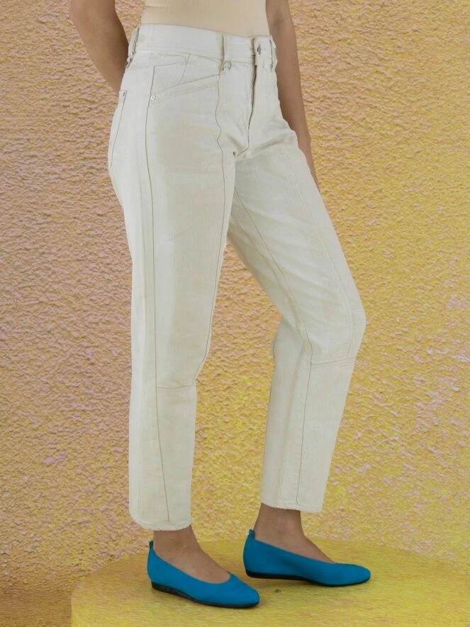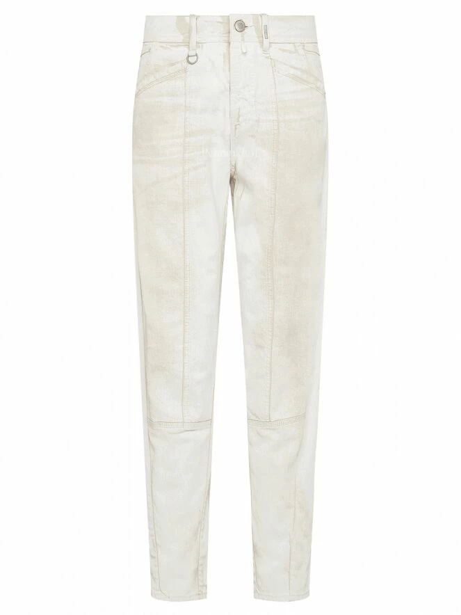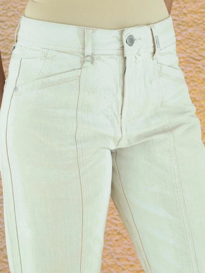 Pantalon de la marque High, aux couleurs blanc crème et beige avec une surimpression blanche irrégulière à effet « craie ». Le pantalon est orné de multiples coutures horizontales et verticales. Lavage à la main.