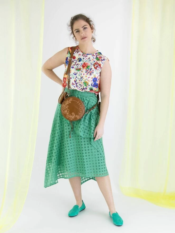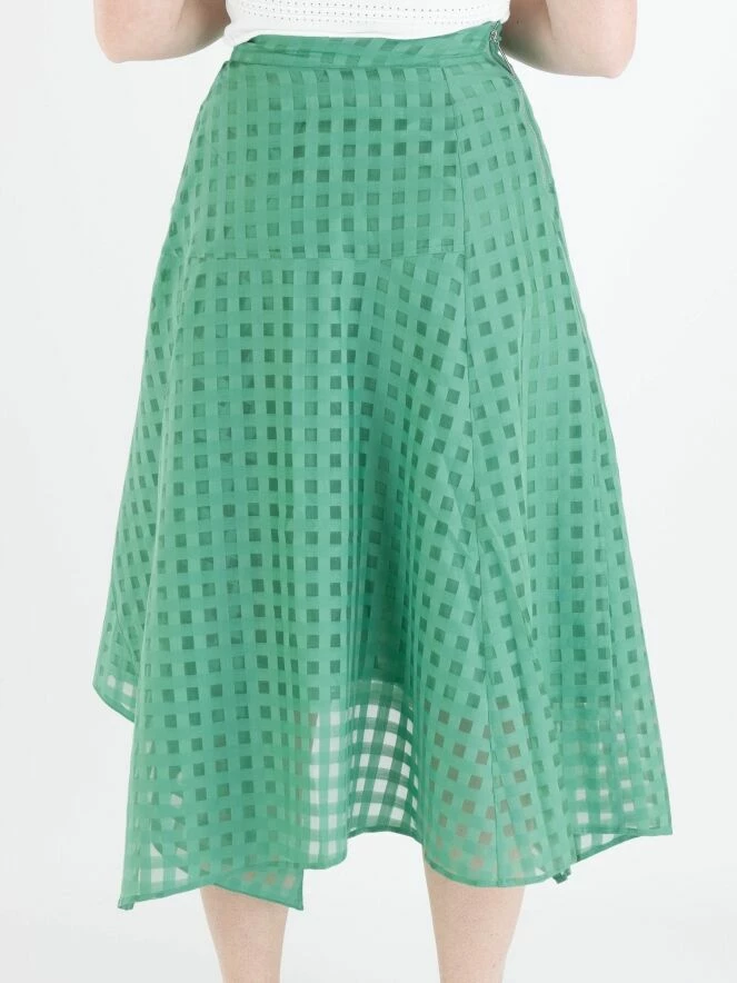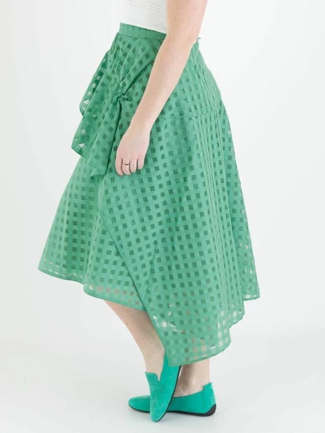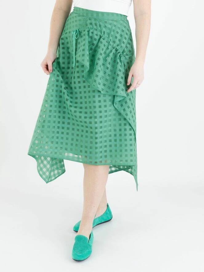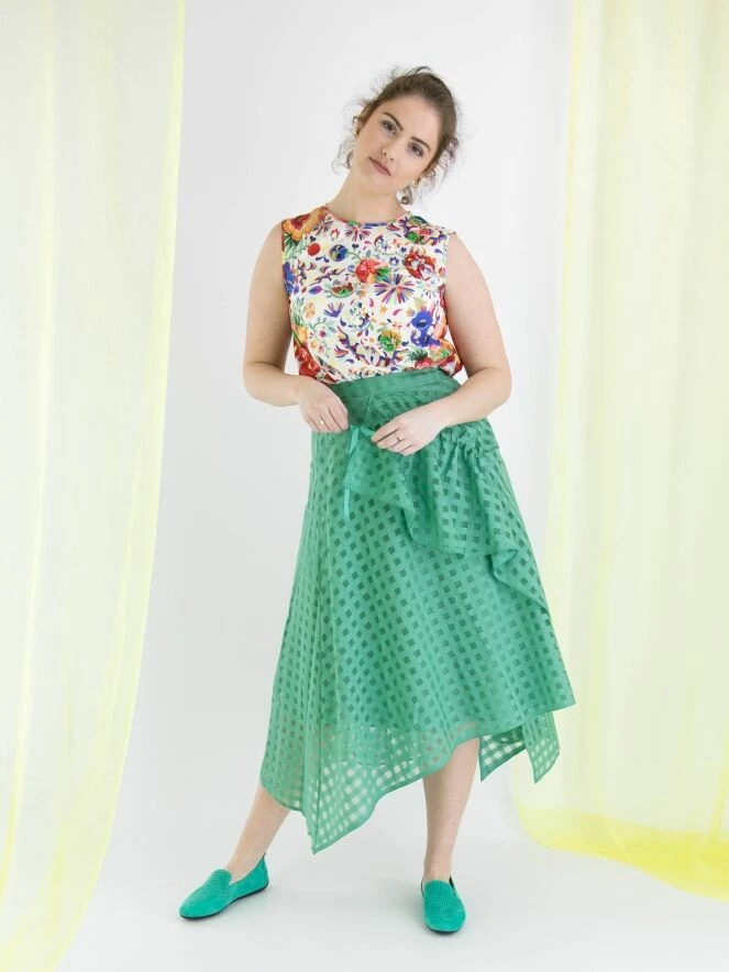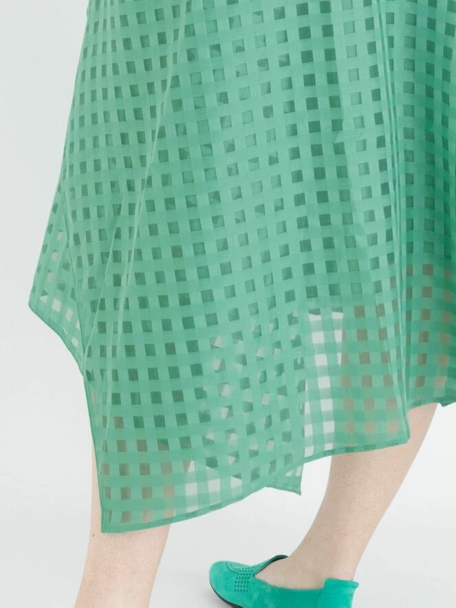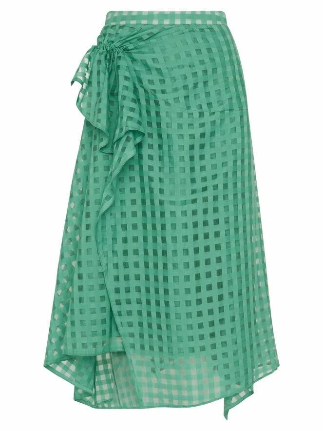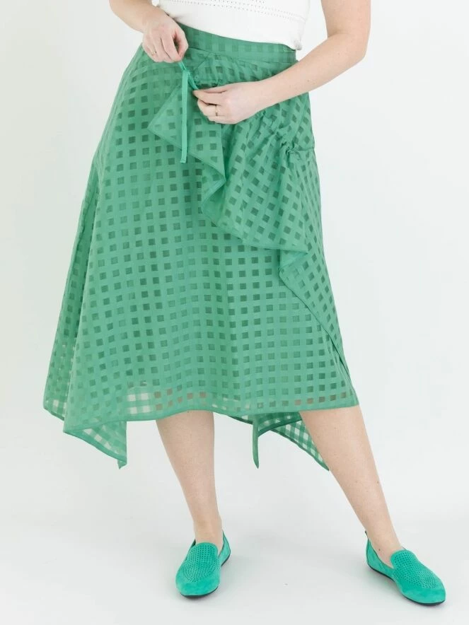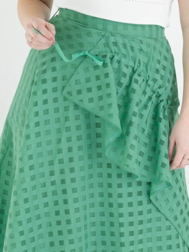Une jupe lĂ©gèrement transparente dans un motif en bloc en vert. Ă€ droite, sous la taille, il y a un ruban dans un traitement en tunnel diagonal jusqu’au milieu de la hanche, ce qui peut crĂ©er un effet plissĂ©. La jupe a un chevauchement diagonal et est doublĂ©e. Cette jupe ne doit pas ĂŞtre lavĂ©e.