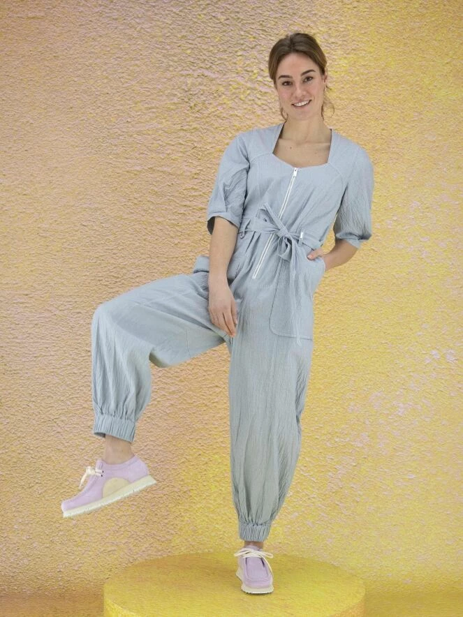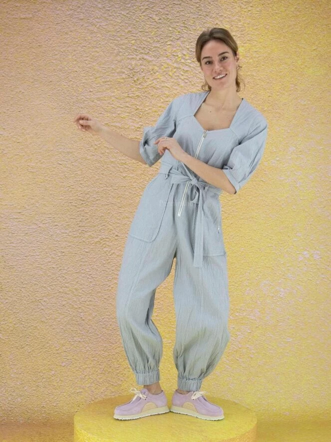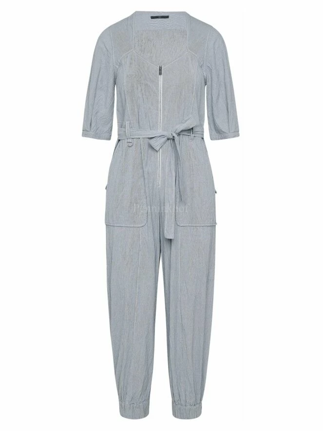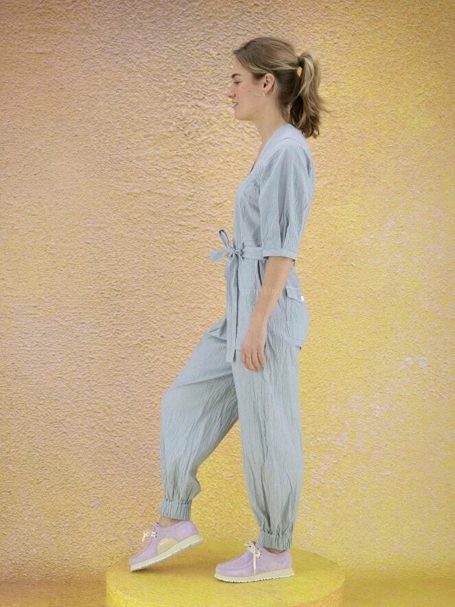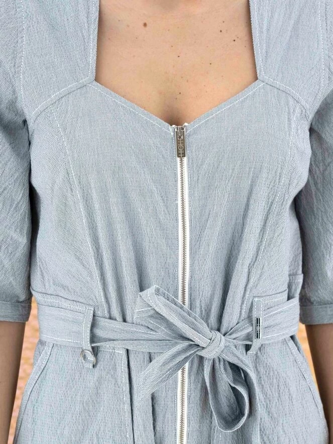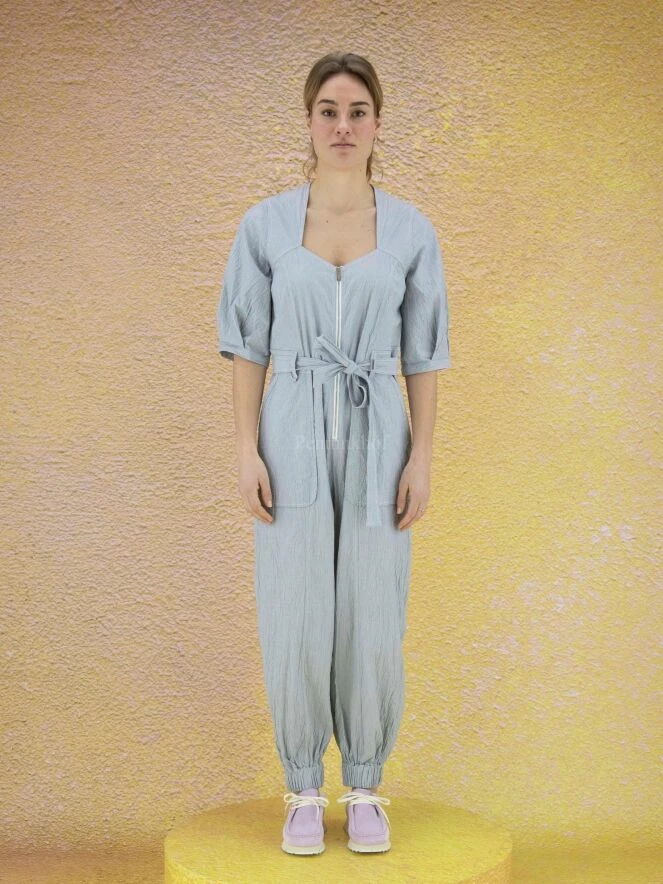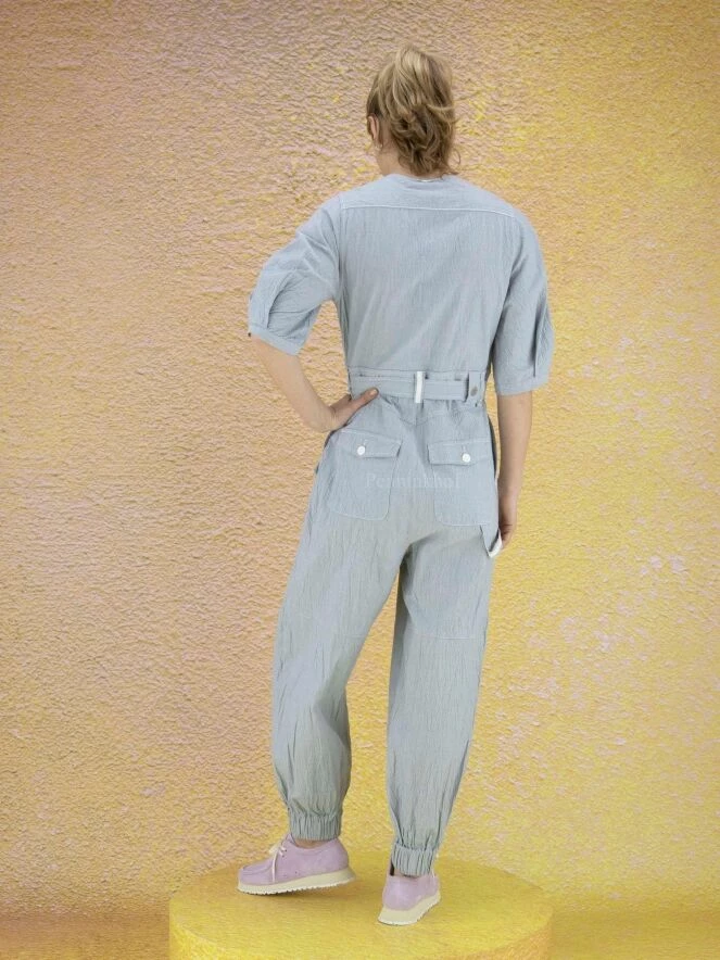 Combinaison Ă manches courtes Ă effet ballon, de la marque High, en seersucker Ă fines rayures aux couleurs bleu et blanc. Une ceinture du mĂŞme tissu est nouĂ©e Ă la taille. De larges poches latĂ©rales sont prĂ©sentes sur le devant de la cuisse et les poches arrière sont Ă rabat boutonnĂ©. La fermeture Eclair part de l’encolure carrĂ©e pour descendre jusqu’au-dessous de la taille. Le bas des jambes est resserrĂ© par une large bande Ă©lastique finement plissĂ©e. Lavage Ă la main.