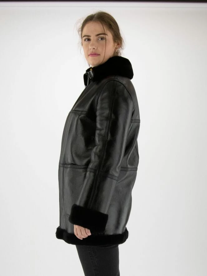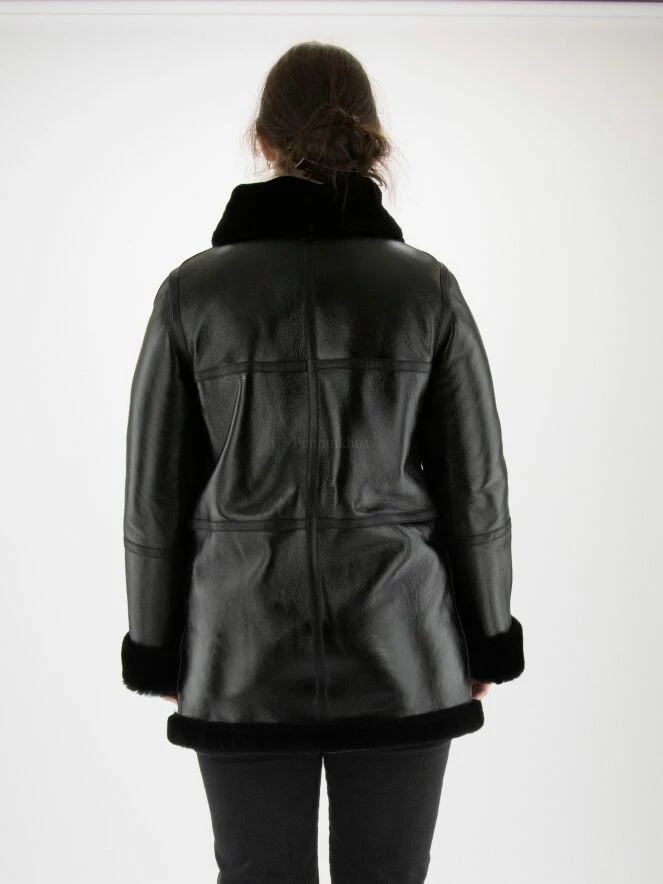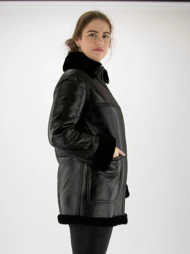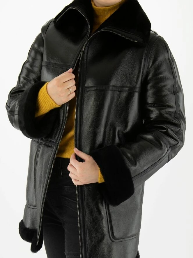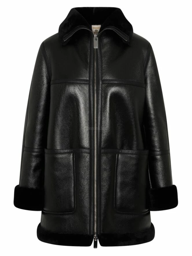 Un manteau en cuir de High de couleur noire. Le manteau est enduit lĂ©gèrement brillant et se ferme par une fermeture Ă glissière. Le bas du manteau est bordĂ© d’une fourrure rasĂ©e, comme le col. Ce manteau ne doit pas ĂŞtre lavĂ©.
