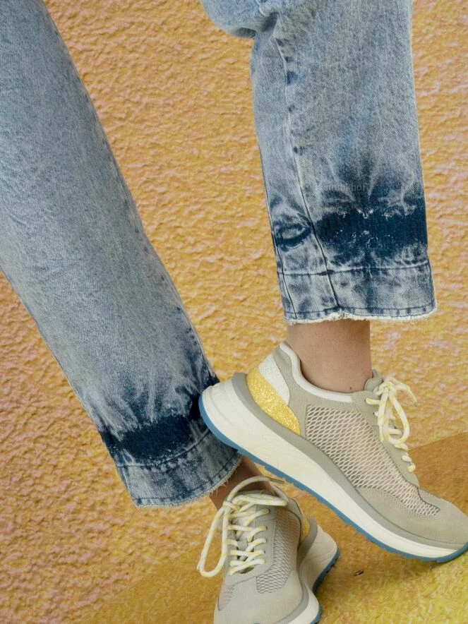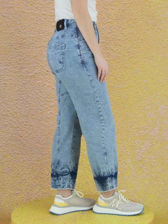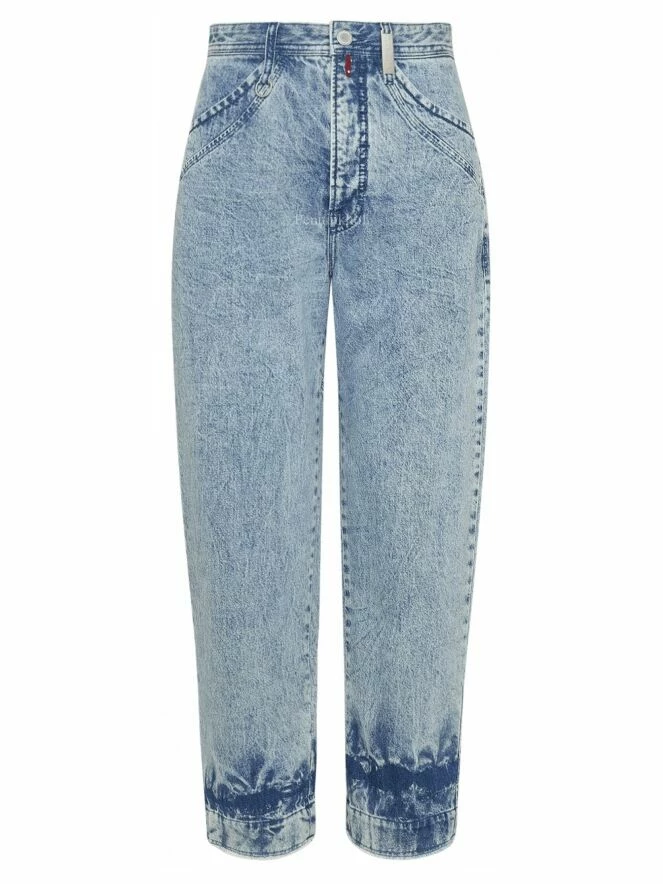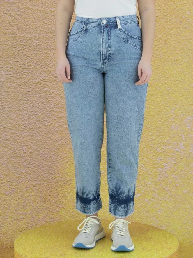 Jean à jambes larges de la marque High, en denim de couleur blue jean clair délavé avec un traitement marbré et des parties plus foncées. Le bord des poches présente une ligne ronde. Le bas des jambes est à effet batik avec des extrémités finement frangées. Lavage à 30 degrés.