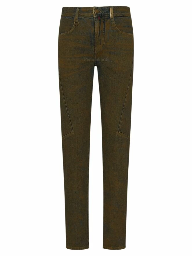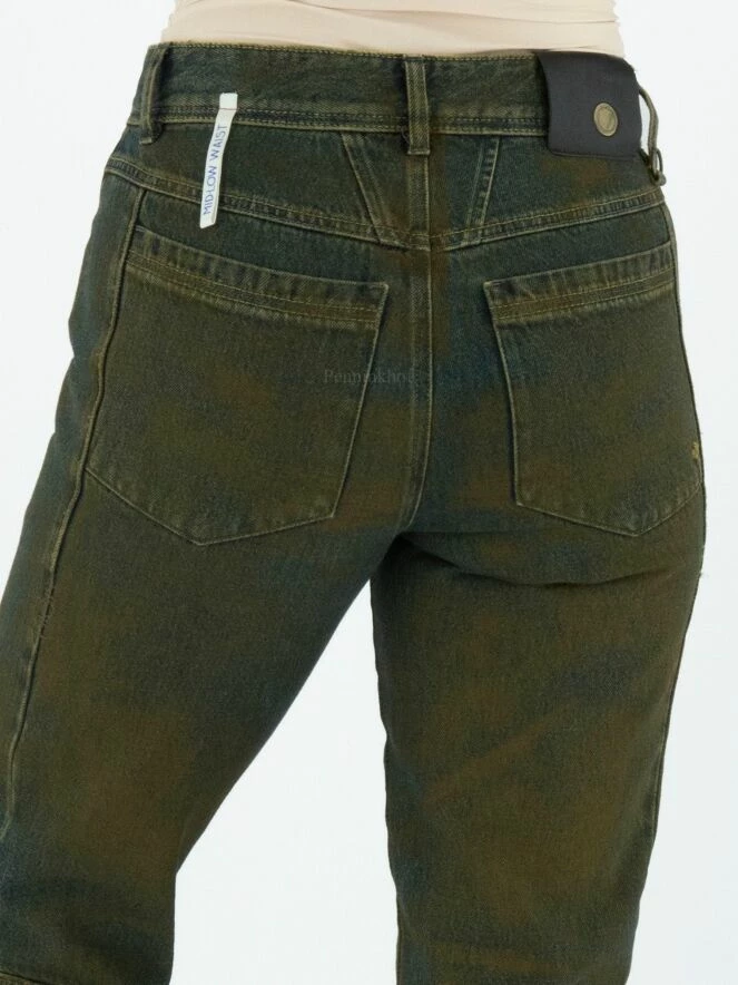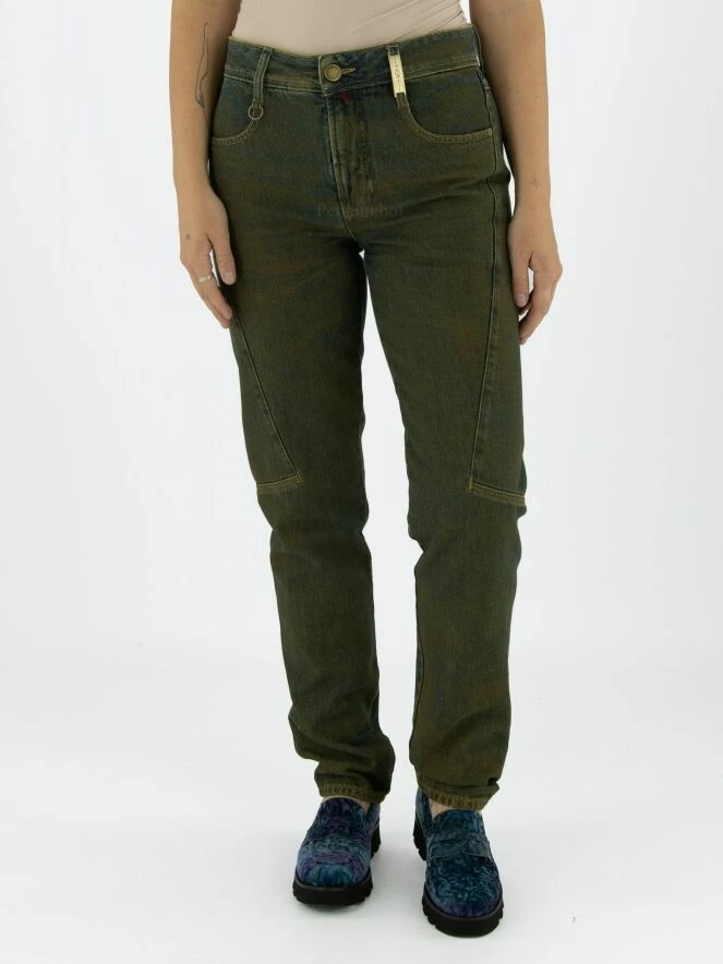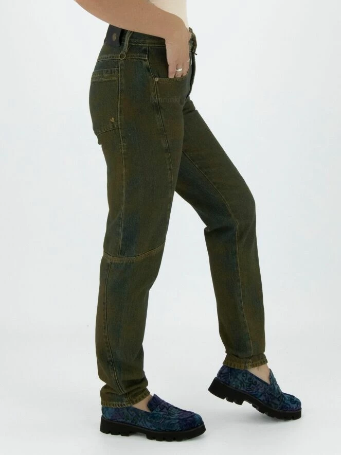 Jeans High dans une couleur verte mélangée avec un fond bleu jeans. Sur le côté de la taille se trouve une couture au milieu au niveau du genou. Ce jeans peut être lavé à la main.
